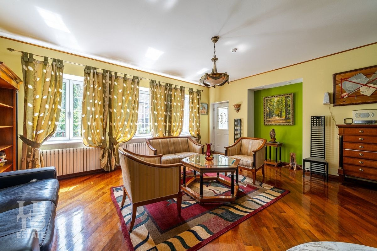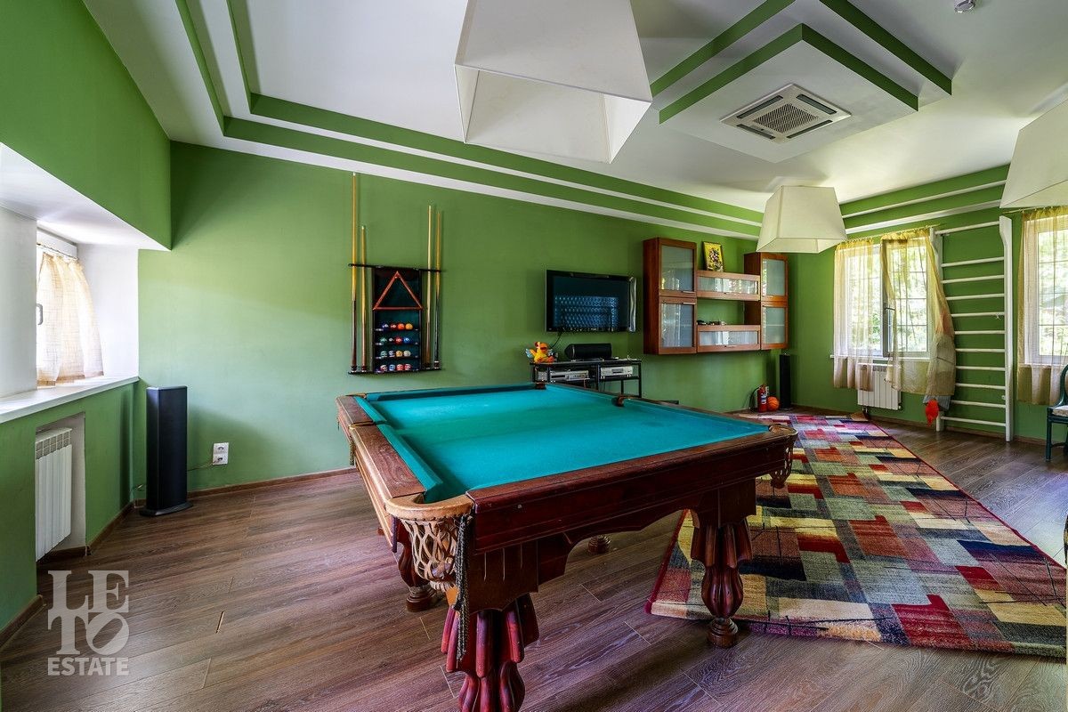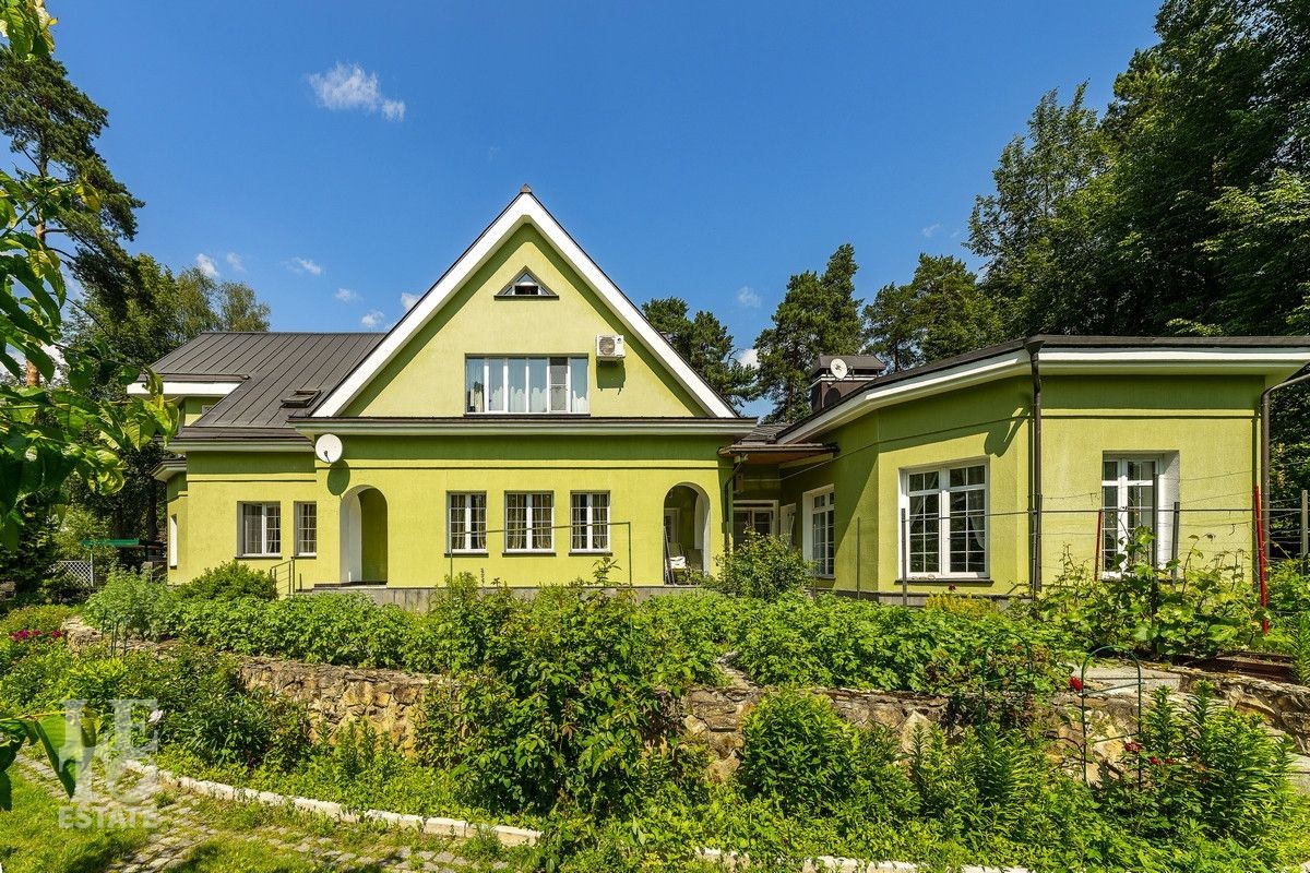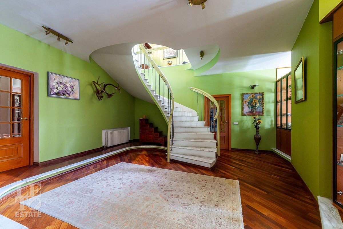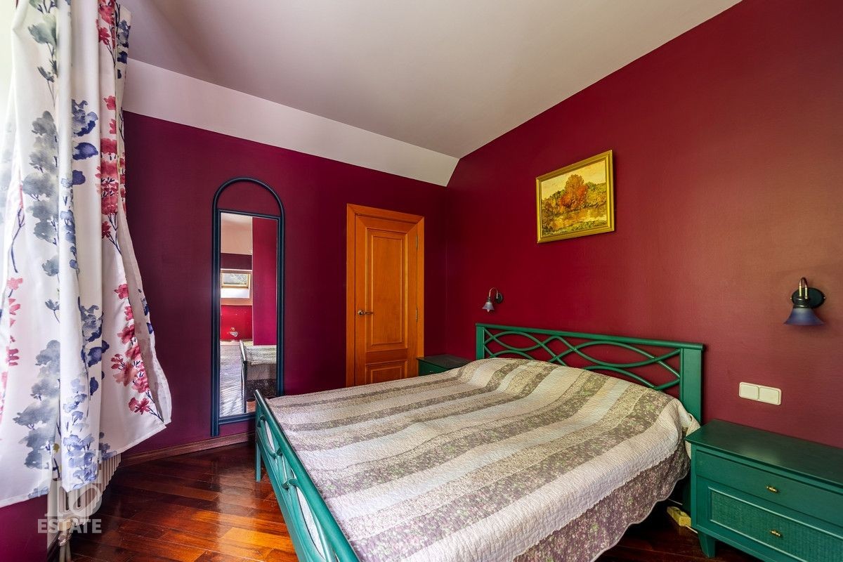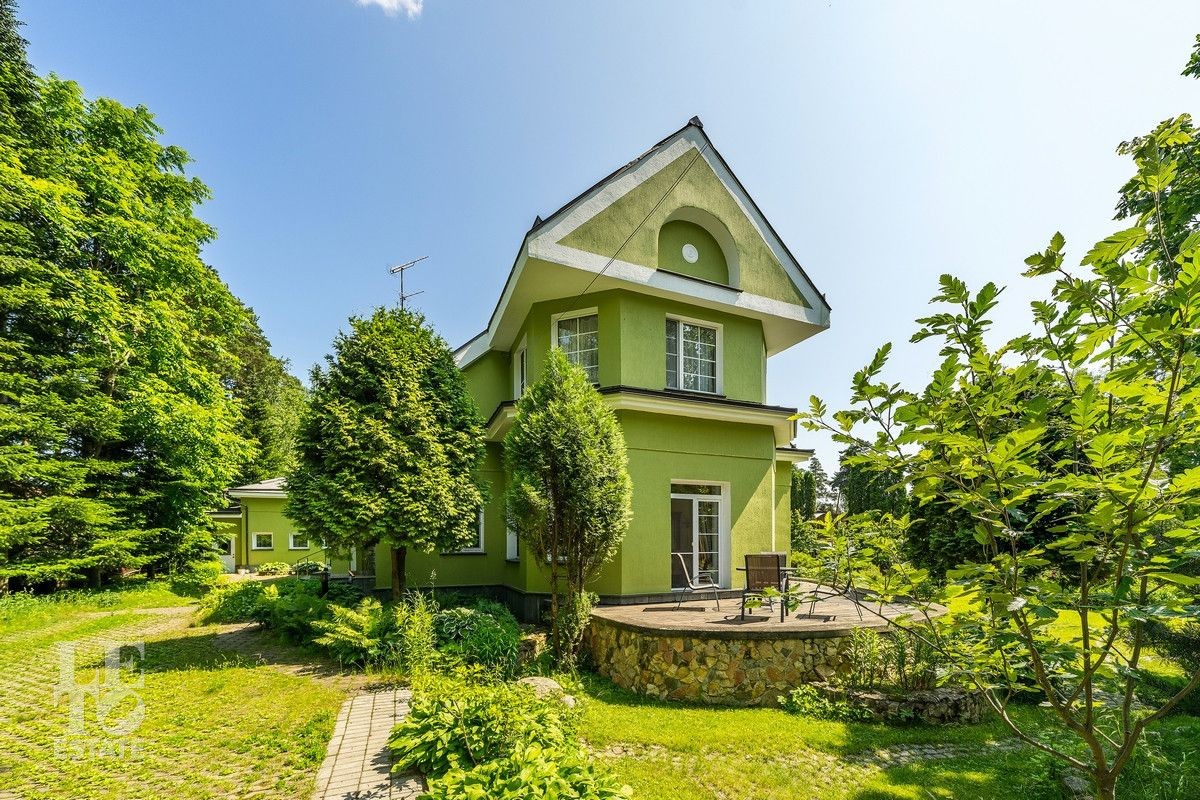Дом «под ключ» площадью 675,8 кв. м построен в два уровня на живописном участке 26 соток и станет прекрасным местом для большой дружной семьи. В доме тщательно продумана организация пространства: семь просторных спален, две гостиные для тёплых семейных вечеров, кухня с выходом на открытую веранду, где особенно приятно проводить утро за чашкой кофе, а также кабинет для уединённой работы, очаровательный зимний сад, изолированный блок для персонала и функциональные помещения для хранения и досуга. Дом построен с соблюдением всех строительных норм и требований: фундамент — ленточный; стены первого этажа — кирпичные; в мансардной части — деревянные (брус 200×200 мм); перекрытия — железобетонные; в мансардной части — деревянные; кровля — медная. В 2021 году была проведена перепланировка и выполнены косметические работы.