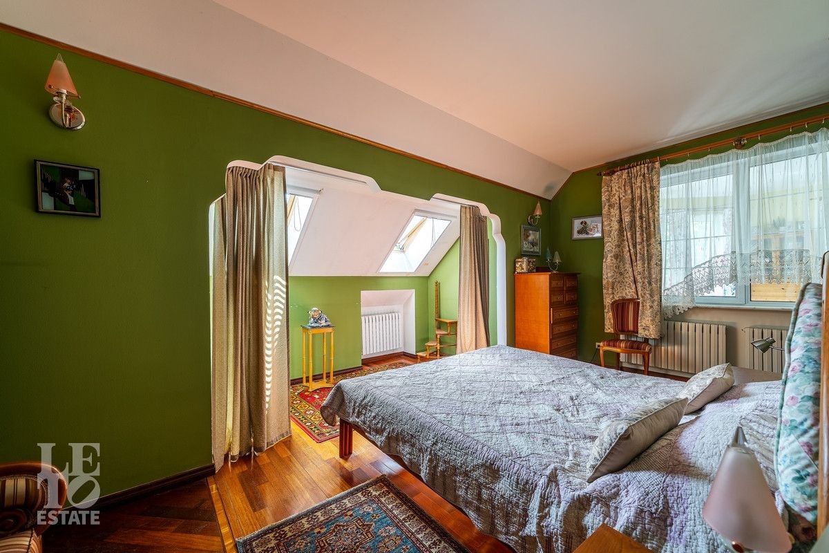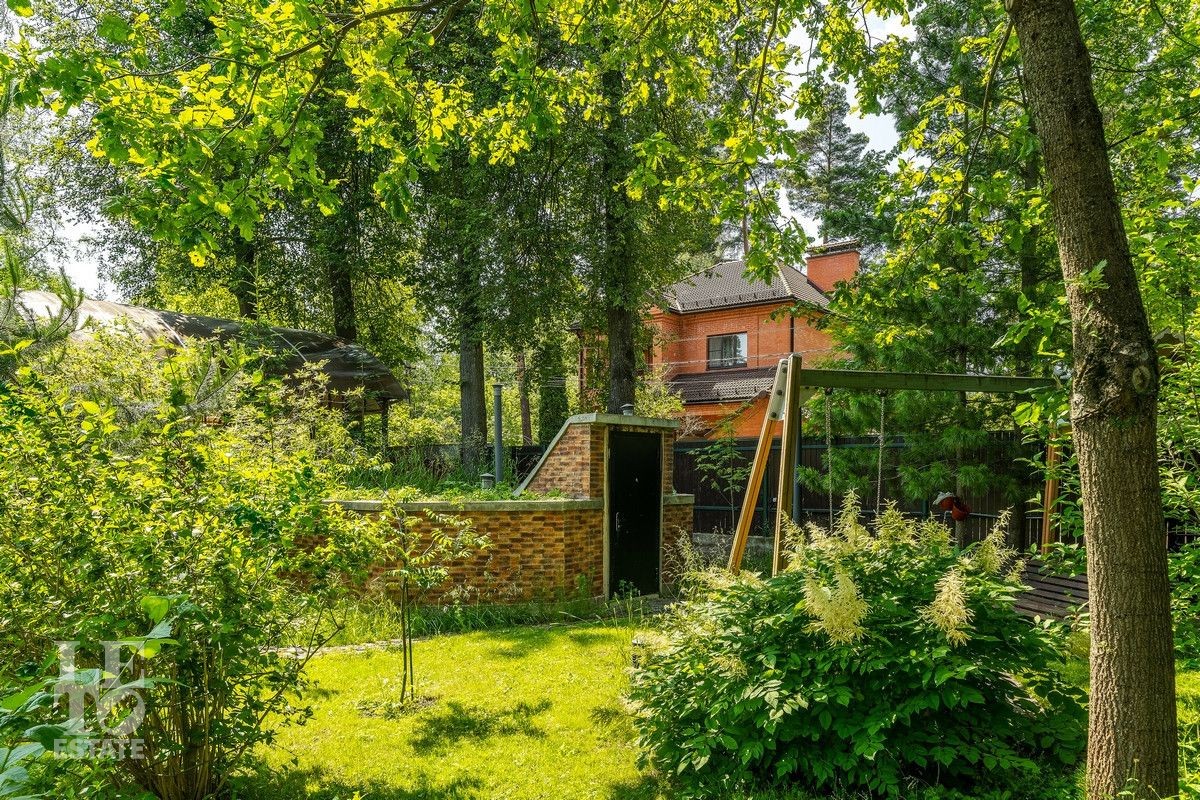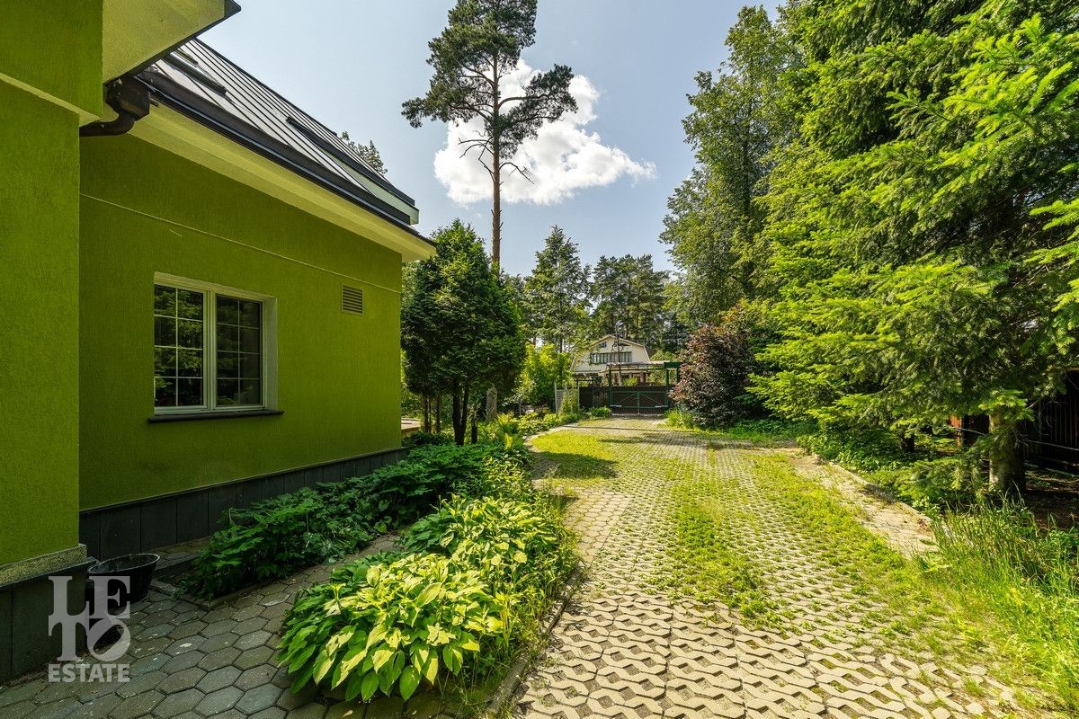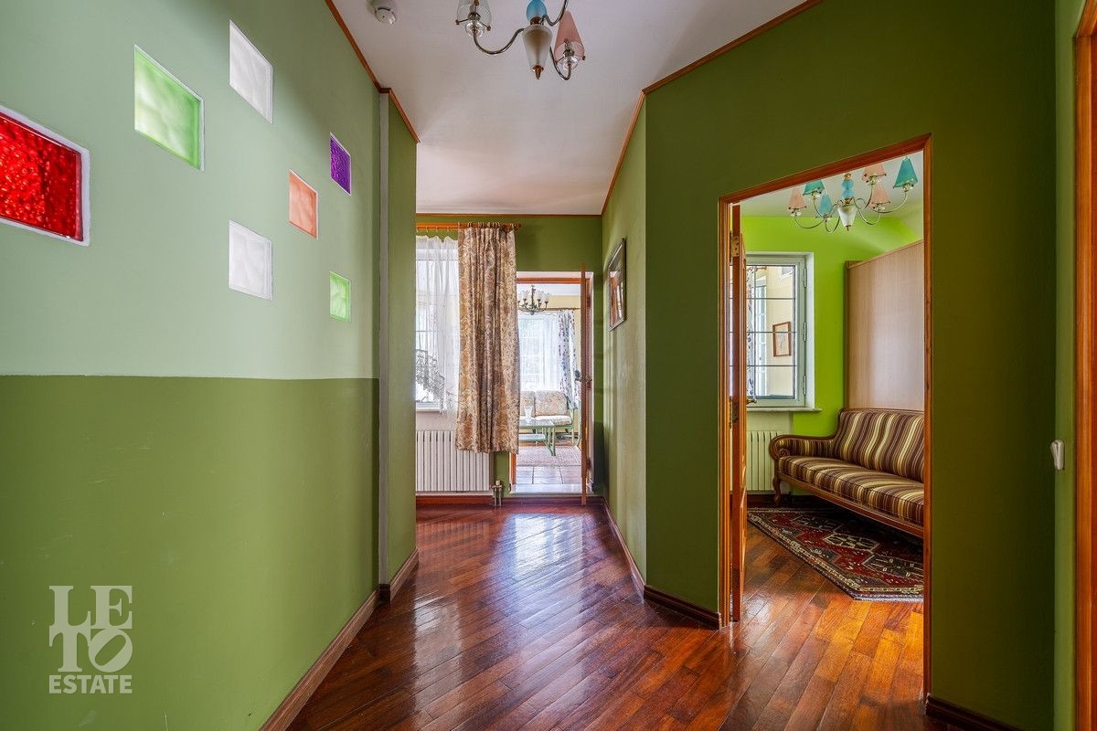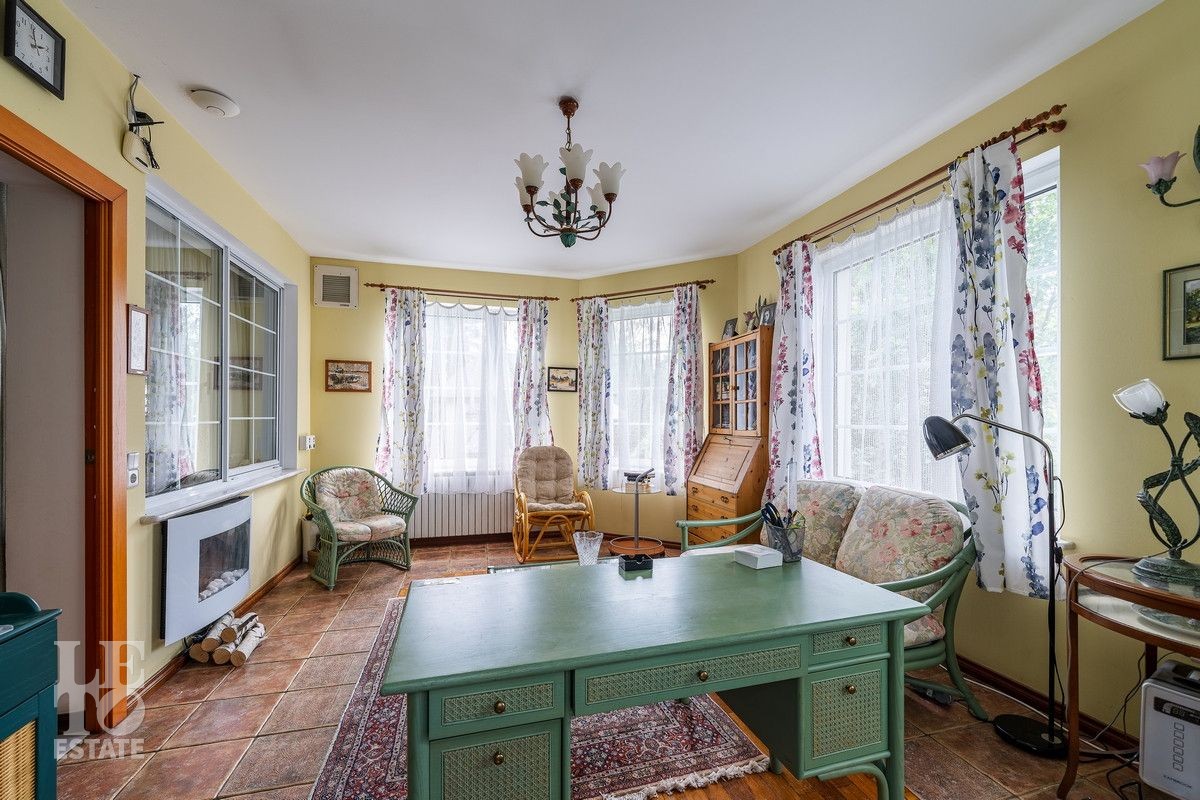 Дом «под ключ» площадью 675,8 кв. м построен в два уровня на живописном участке 26 соток и станет прекрасным местом для большой дружной семьи. В доме тщательно продумана организация пространства: семь просторных спален, две гостиные для тёплых семейных вечеров, кухня с выходом на открытую веранду, где особенно приятно проводить утро за чашкой кофе, а также кабинет для уединённой работы, очаровательный зимний сад, изолированный блок для персонала и функциональные помещения для хранения и досуга. Дом построен с соблюдением всех строительных норм и требований: фундамент — ленточный; стены первого этажа — кирпичные; в мансардной части — деревянные (брус 200×200 мм); перекрытия — железобетонные; в мансардной части — деревянные; кровля — медная. В 2021 году была проведена перепланировка и выполнены косметические работы.