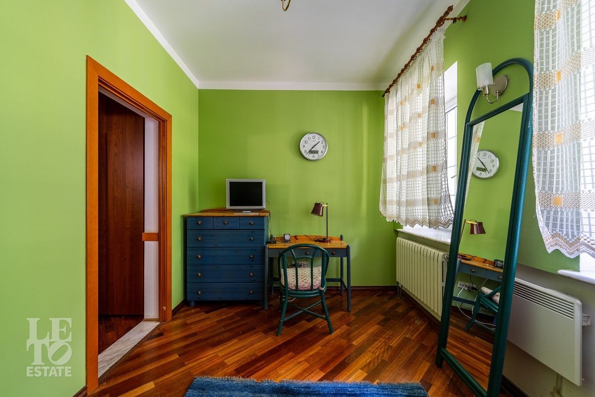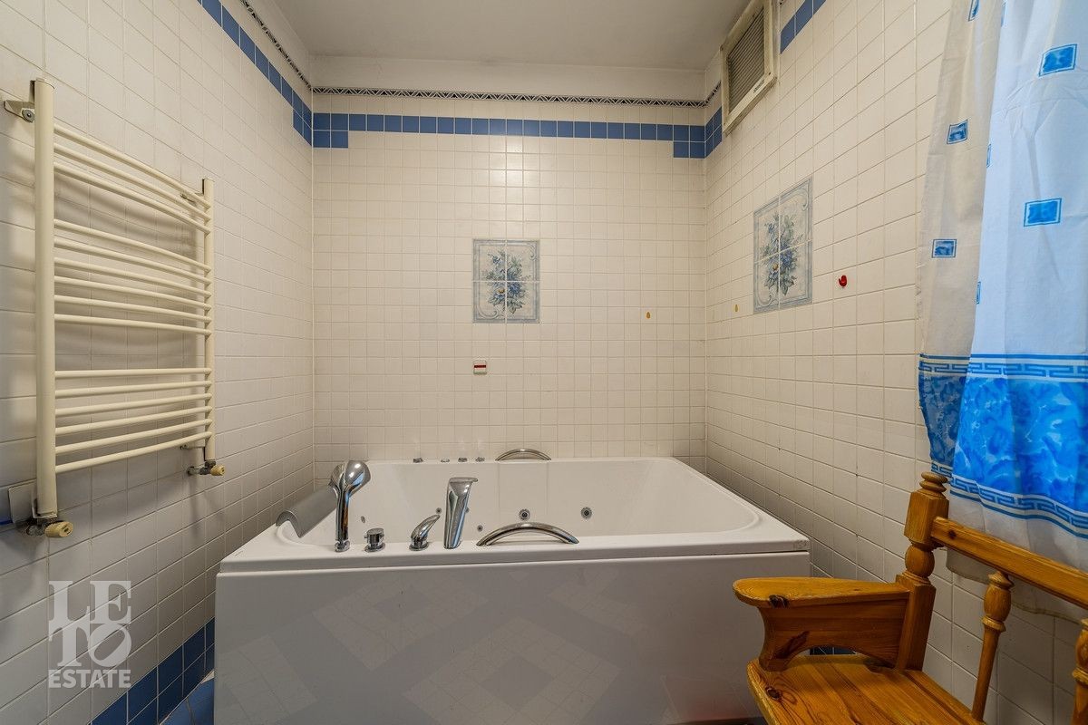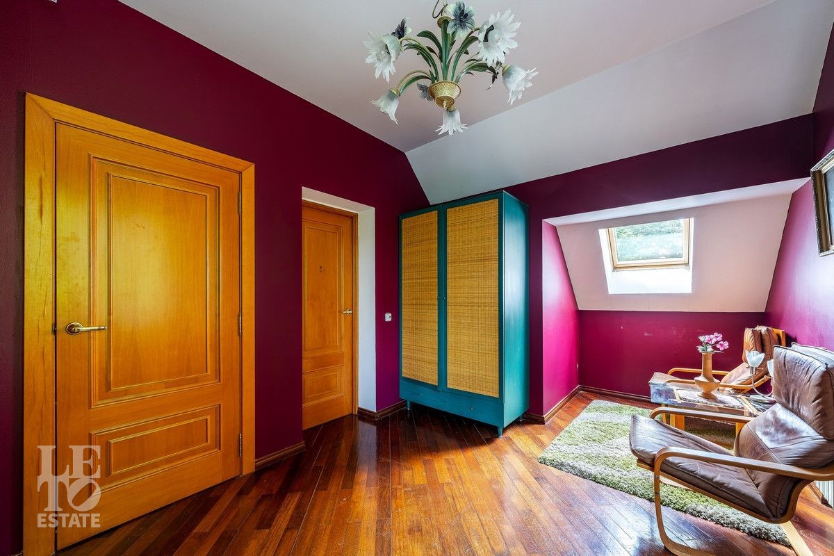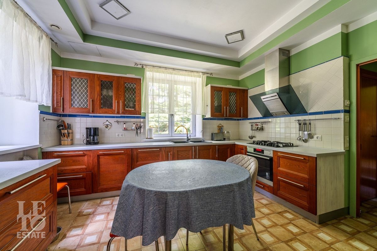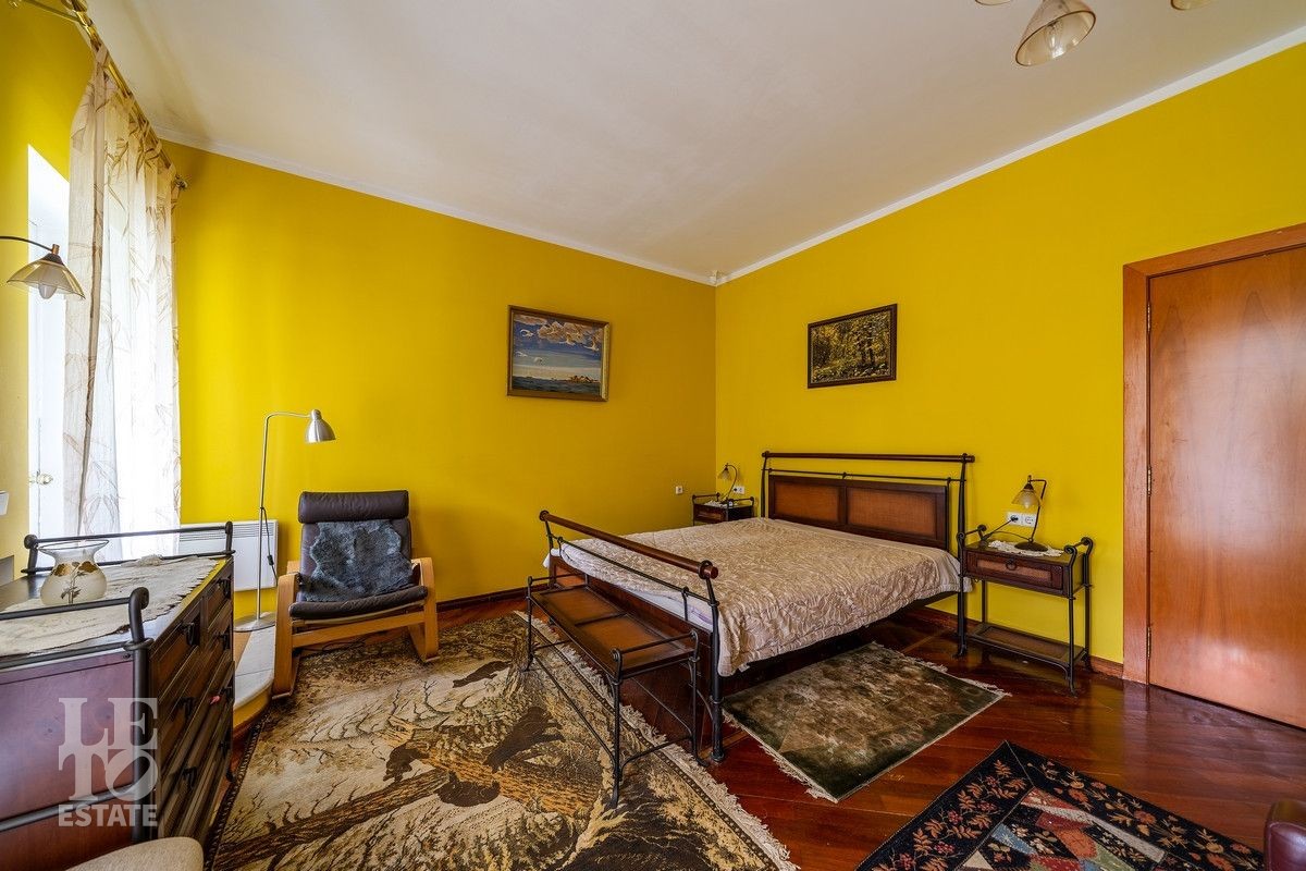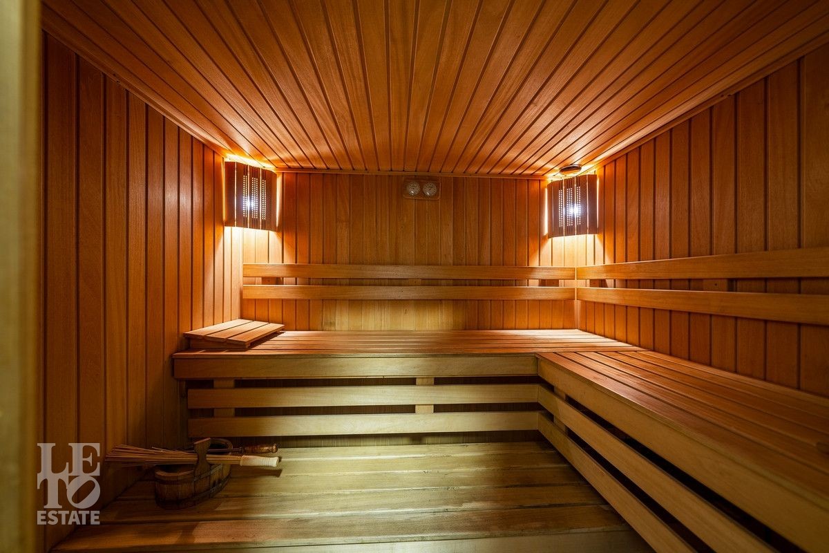 Дом «под ключ» площадью 675,8 кв. м построен в два уровня на живописном участке 26 соток и станет прекрасным местом для большой дружной семьи. В доме тщательно продумана организация пространства: семь просторных спален, две гостиные для тёплых семейных вечеров, кухня с выходом на открытую веранду, где особенно приятно проводить утро за чашкой кофе, а также кабинет для уединённой работы, очаровательный зимний сад, изолированный блок для персонала и функциональные помещения для хранения и досуга. Дом построен с соблюдением всех строительных норм и требований: фундамент — ленточный; стены первого этажа — кирпичные; в мансардной части — деревянные (брус 200×200 мм); перекрытия — железобетонные; в мансардной части — деревянные; кровля — медная. В 2021 году была проведена перепланировка и выполнены косметические работы.