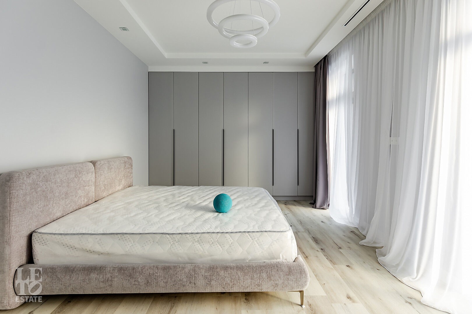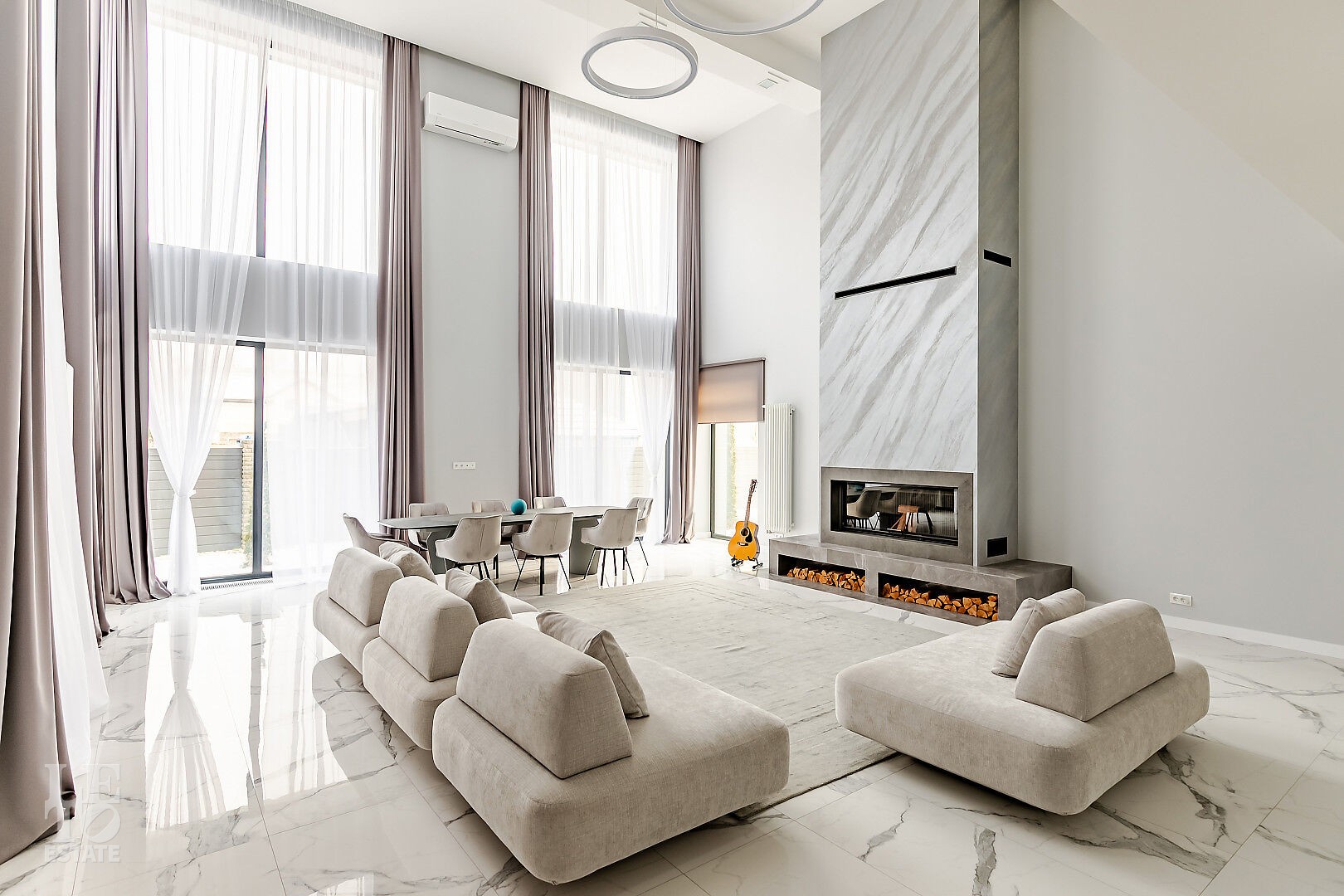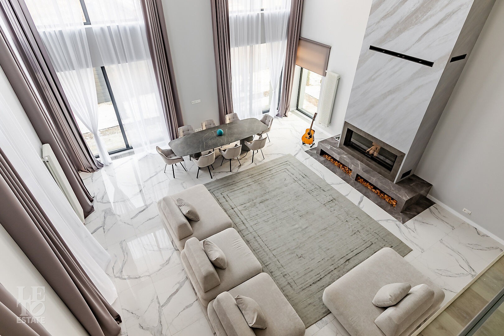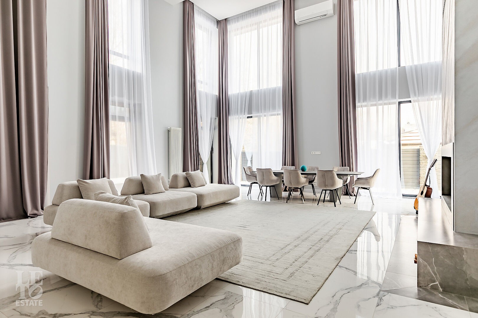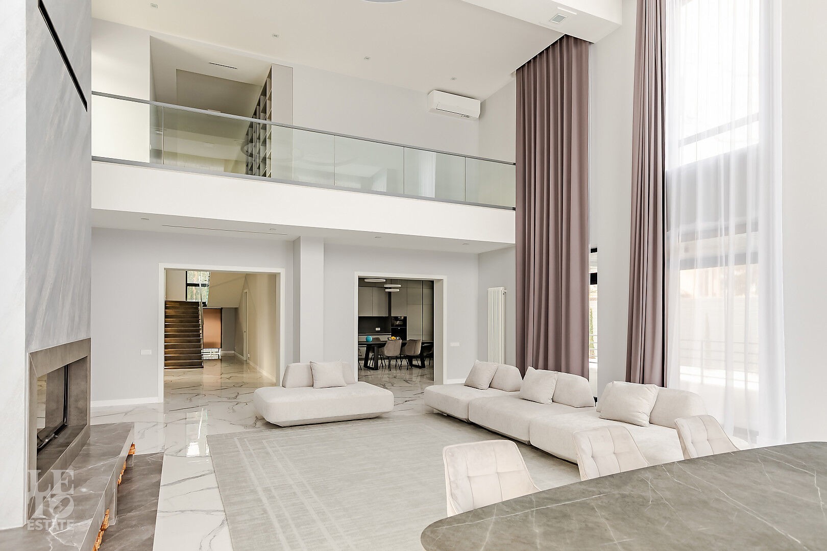 Высокое качество строительства и отделки. Панорамные окна в пол наполняют пространство солнечным светом и делают его более свободным и открытым. Интерьеры выполнены в светлых тонах, в отделке использованы только самые качественные материалы. Отделка и меблировка представляют собой единое дизайнерское решение. Высококлассная дорогая мебель, ультрасовременное бытовое оборудование и техника премиальных брендов. По всему периметру дома просторные террасы.
