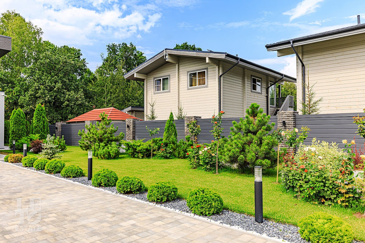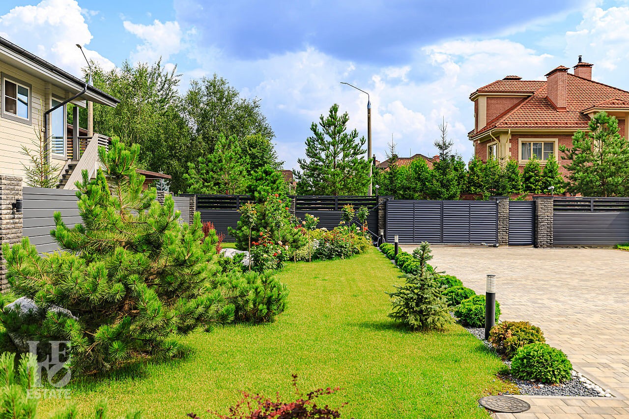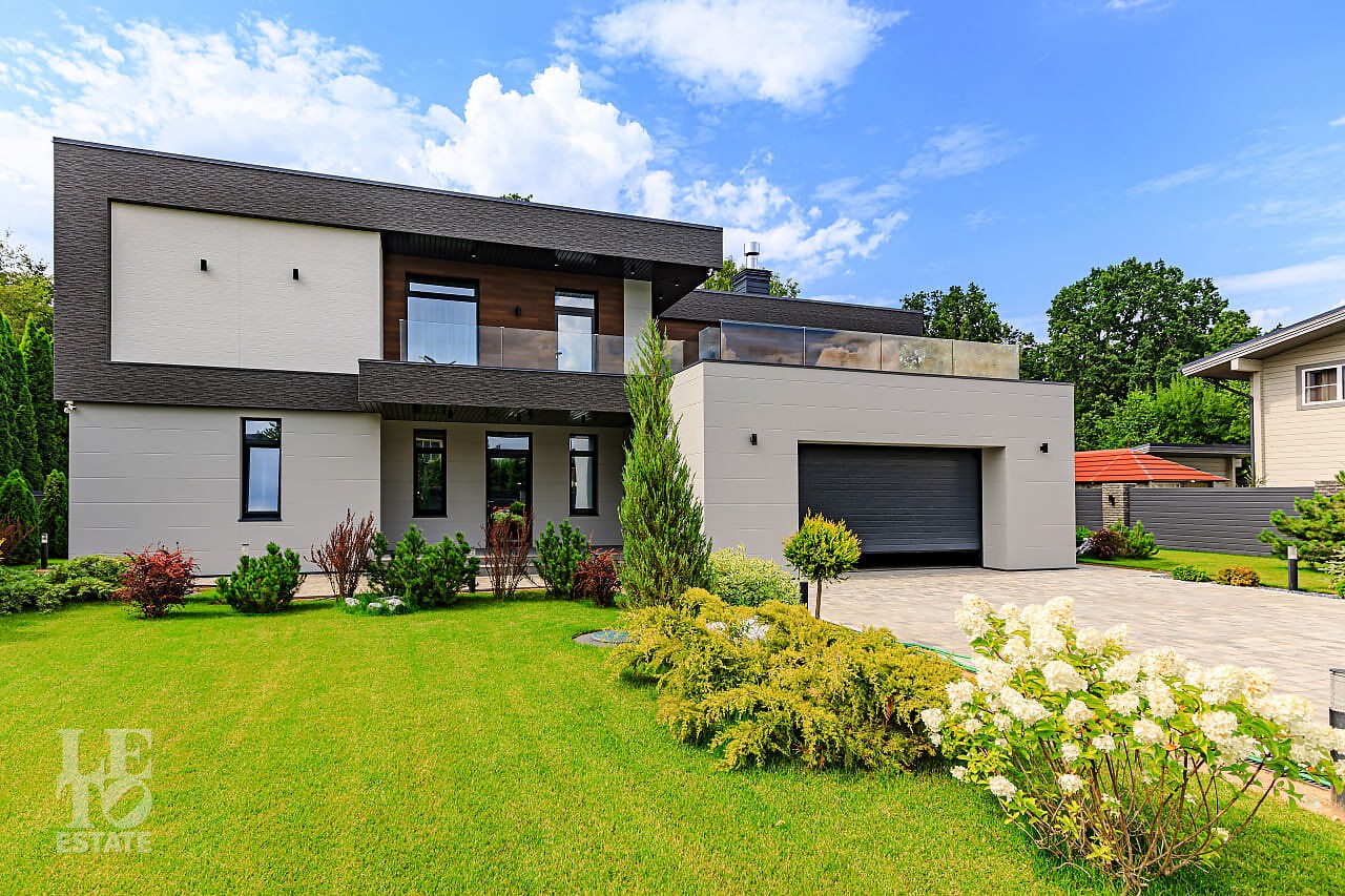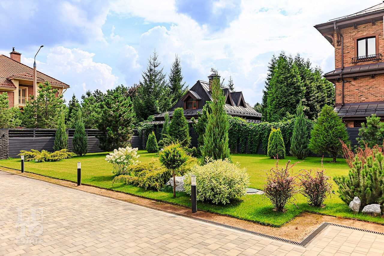 Встроенный гараж на две машины не только удобен, но и добавляет дополнительный уровень безопасности для ваших автомобилей. На участке выполнен профессиональный ландшафтный дизайн, по периметру высажены туи и кустарники, предусмотрена дренажная система, обустроены дорожки и установлены фонарики.