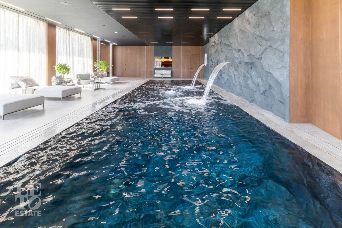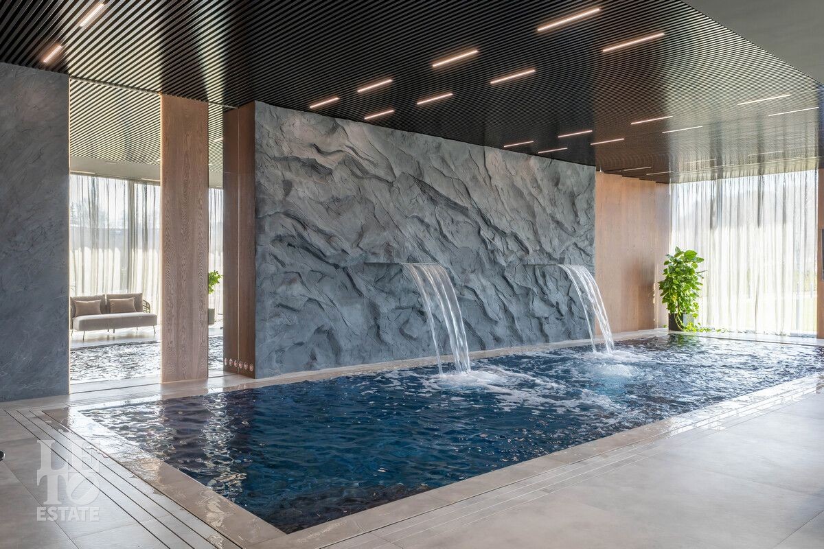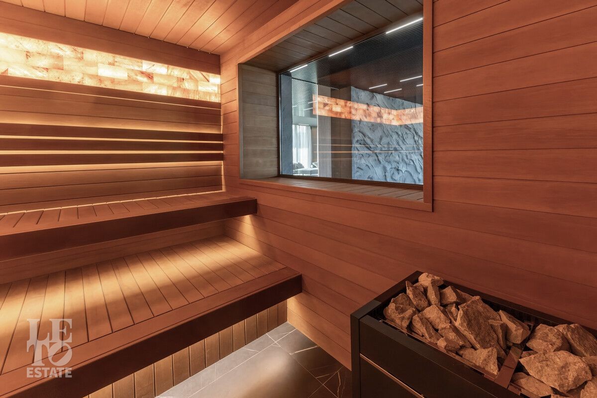 Первый этаж: гостиная со вторым светом и камином, кухня-столовая, рабочая кухня, гостевой санузел, гардеробная, гостевая спальня, кладовая, постирочная, SPA-зона с бассейном, хаммамом и сауной, квартира для персонала с двумя спальнями, гараж на два автомобиля, навес на два автомобиля;