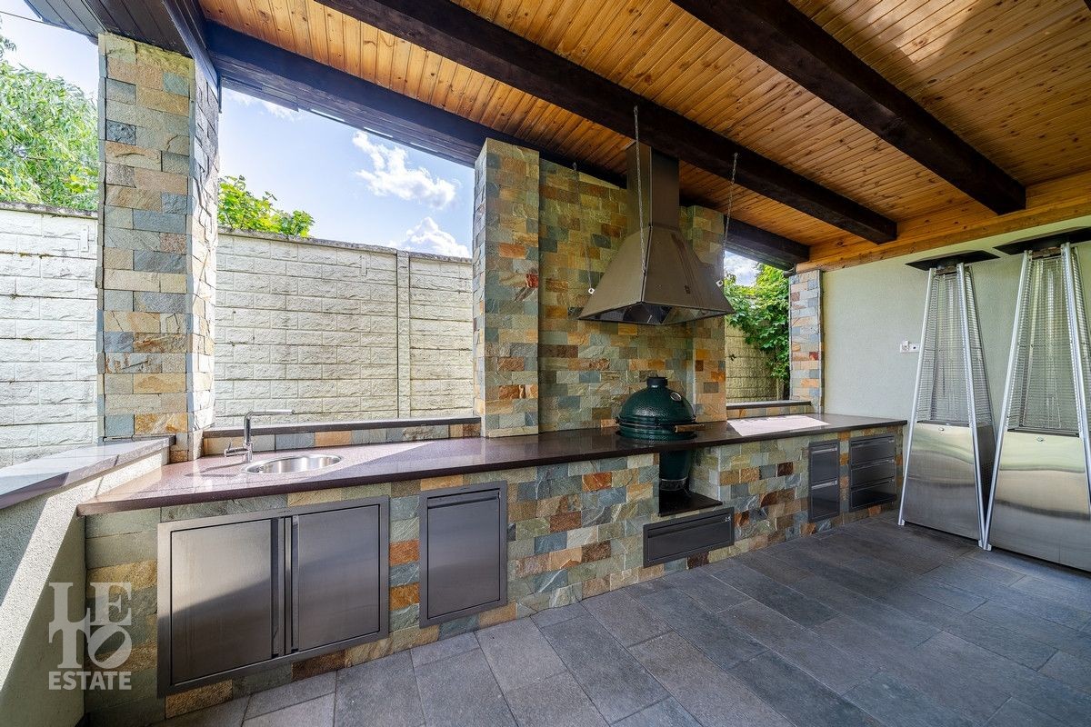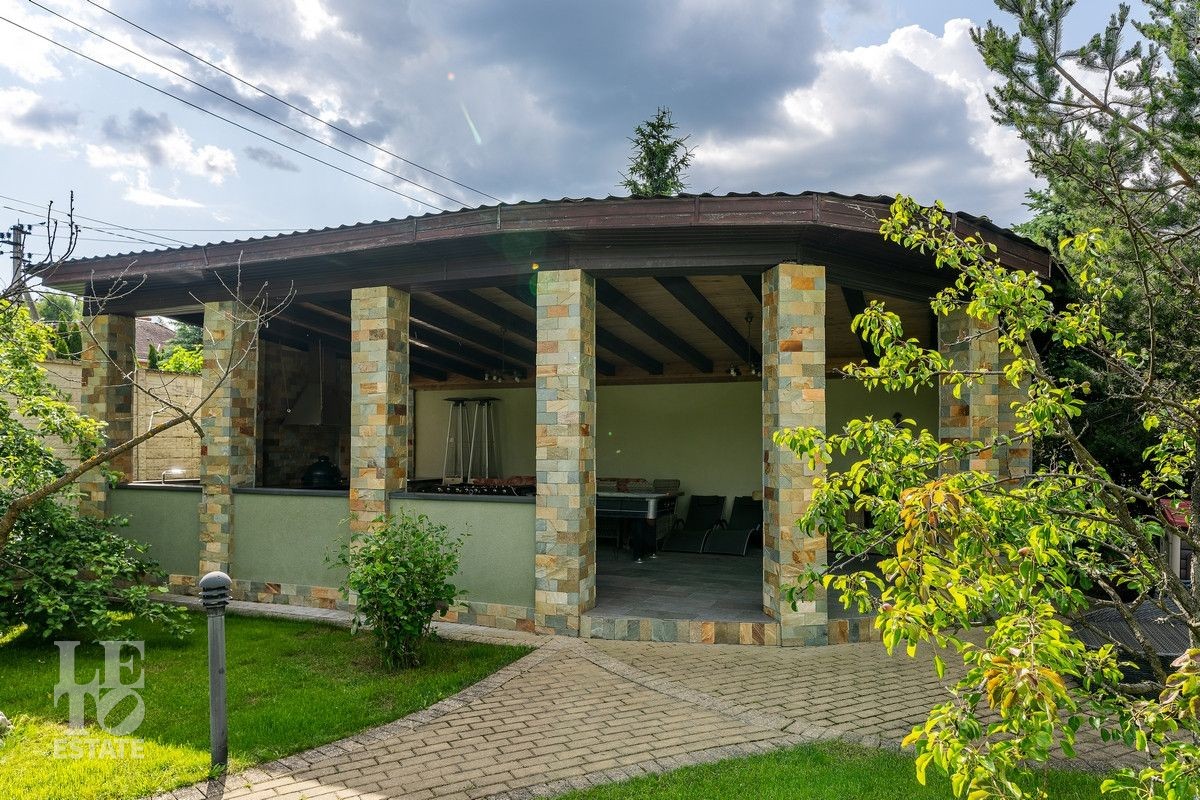 На участке выполнен ландшафтный дизайн, установлено уличное освещение, система автоматического полива, дренаж, дорожки вымощены клинкерной плиткой, посажены плодовые деревья, декоративные растения и кустарники, установлен домик для хранения хозяйственного инвентаря и организована зона барбекю с эко-грилем Lappigrill-BBQ станет отличным местом для проведения праздников и встреч с друзьями.