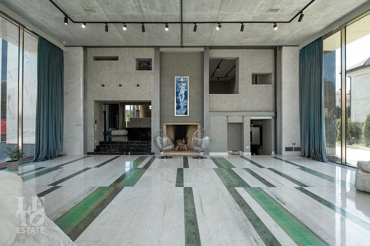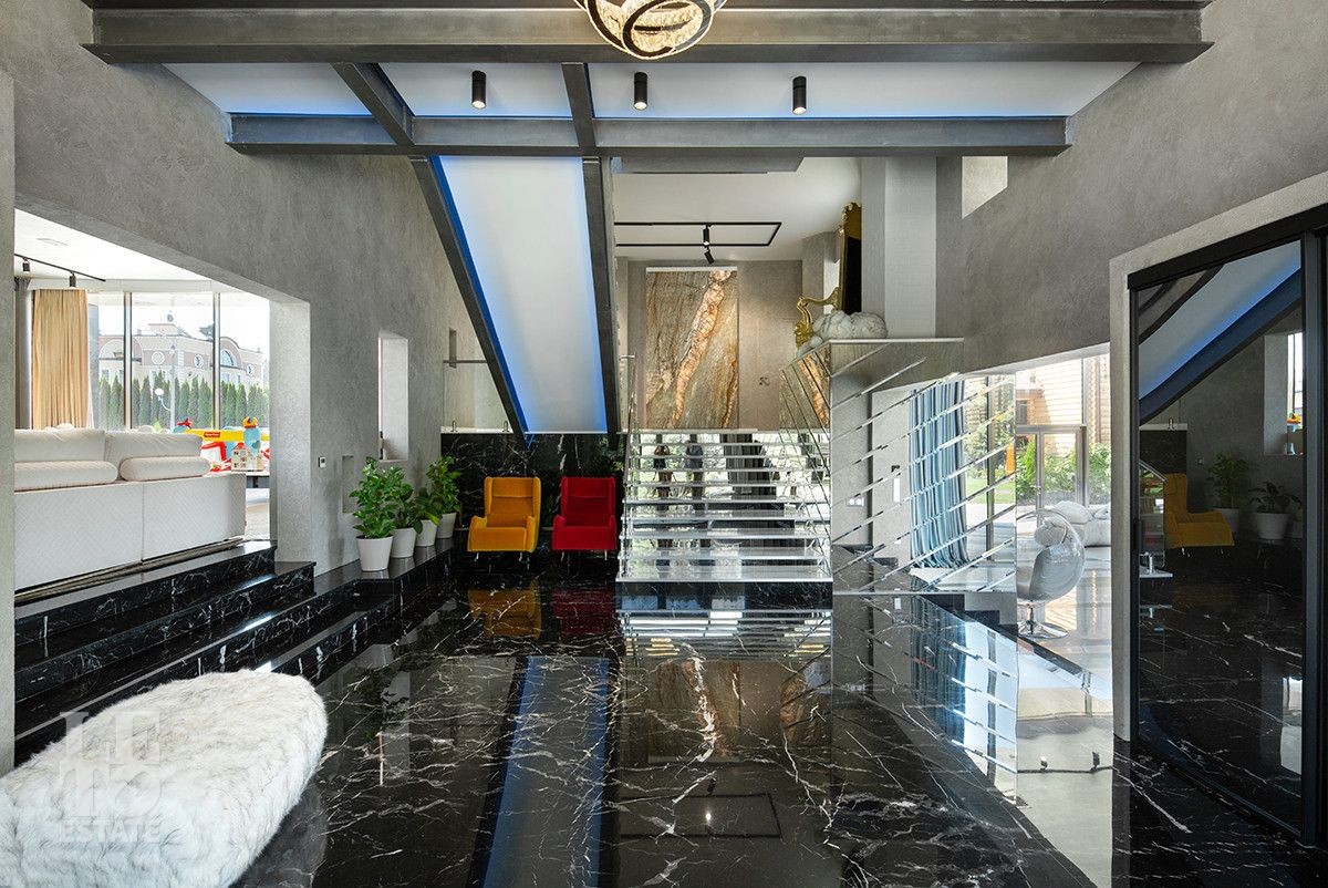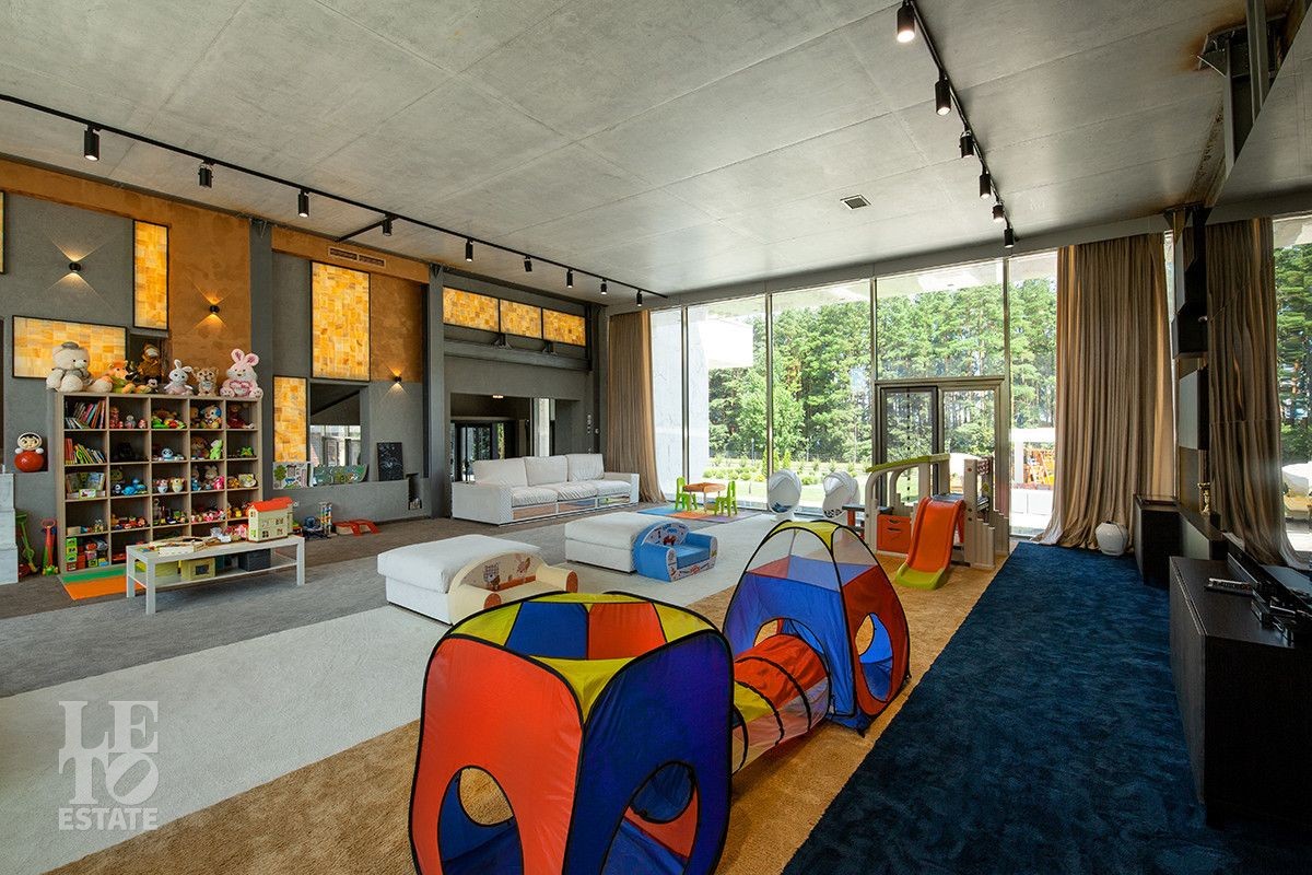 Первый этаж - прихожая, гостиная-столовая с камином, гостиная-кинотеатр с системой домашнего кинотеатра и монитором состоящим из девяти блоков, санузел, постирочная;