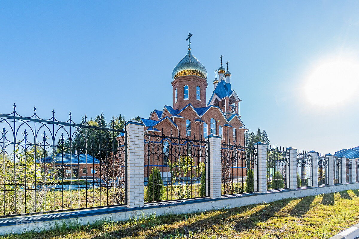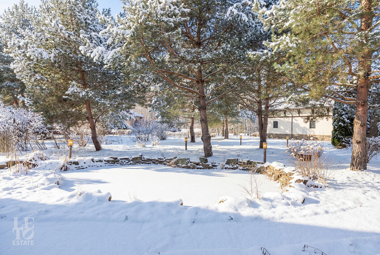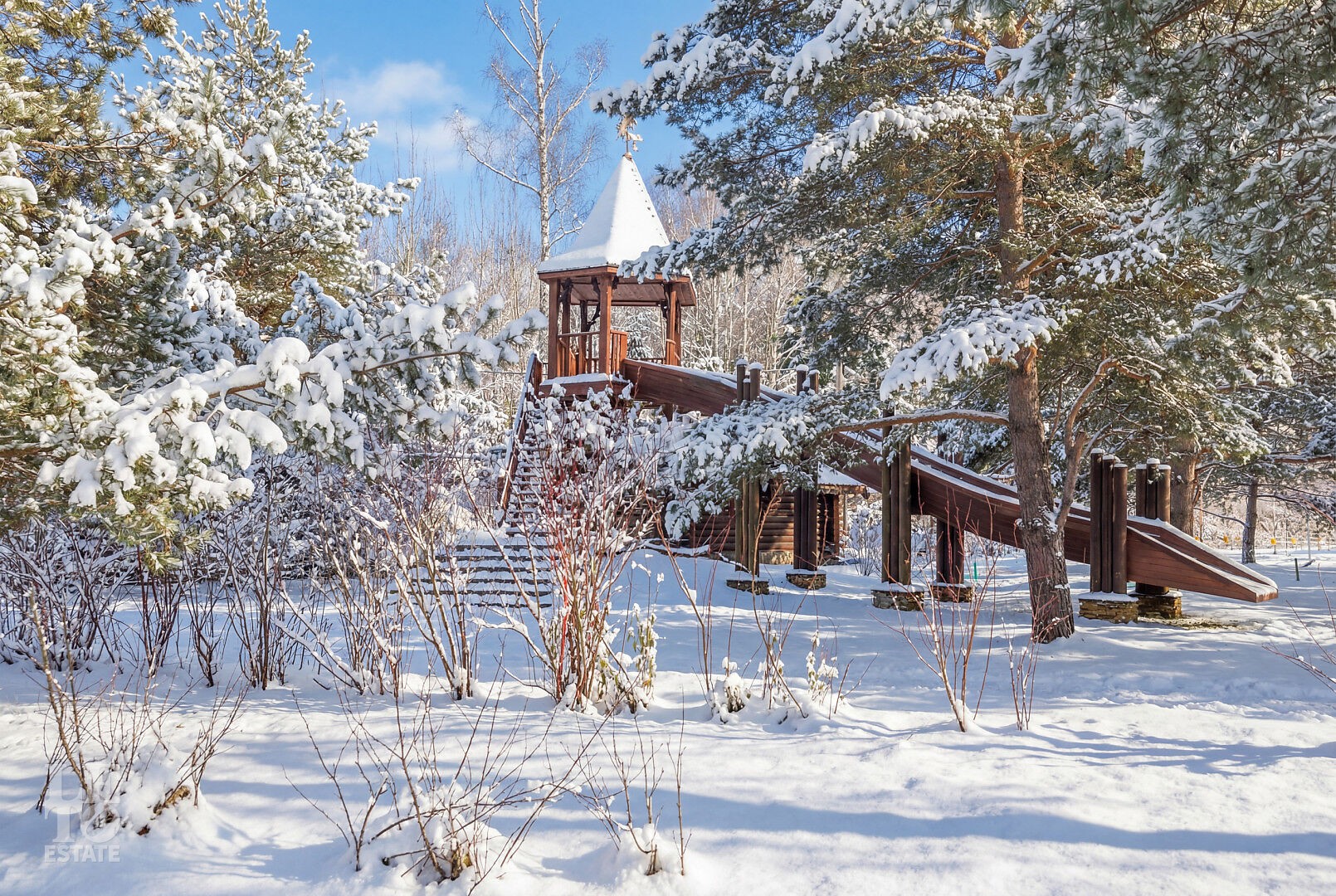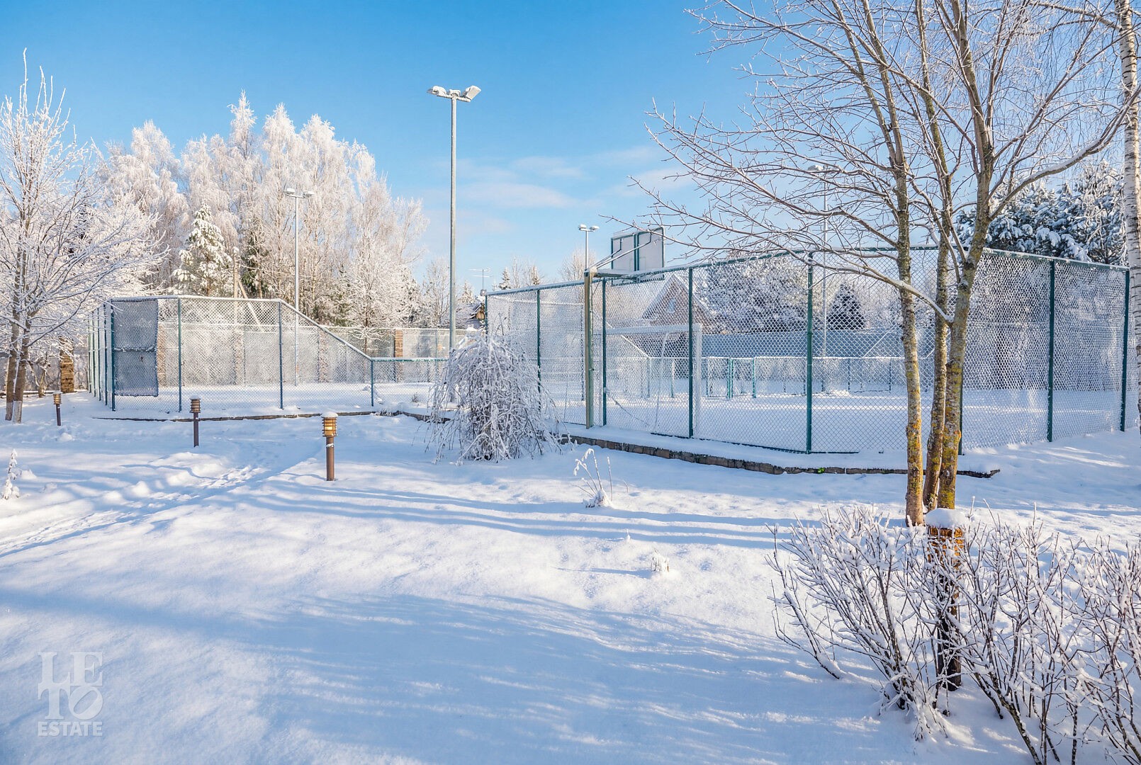 На участке разместились: теннисный корт с мачтами освещения и дренажной системой; футбольное поле и баскетбольная площадка; беседка для барбекю; декоративный пруд;