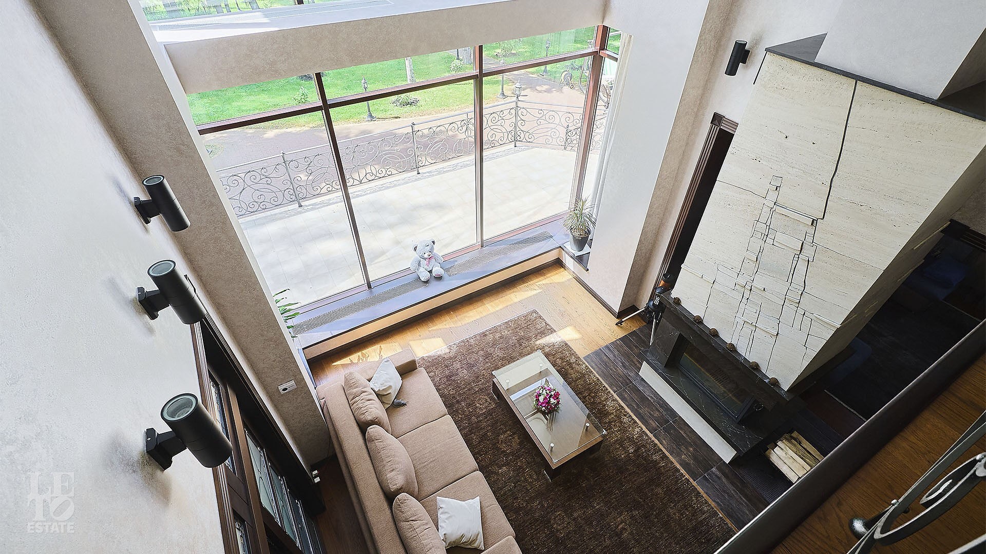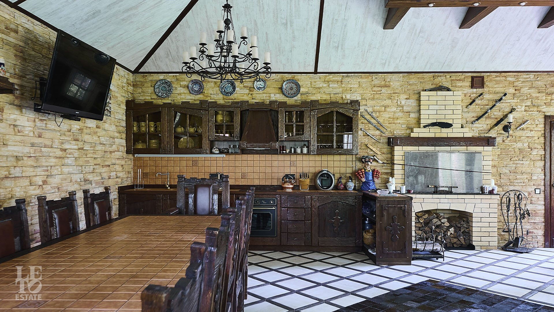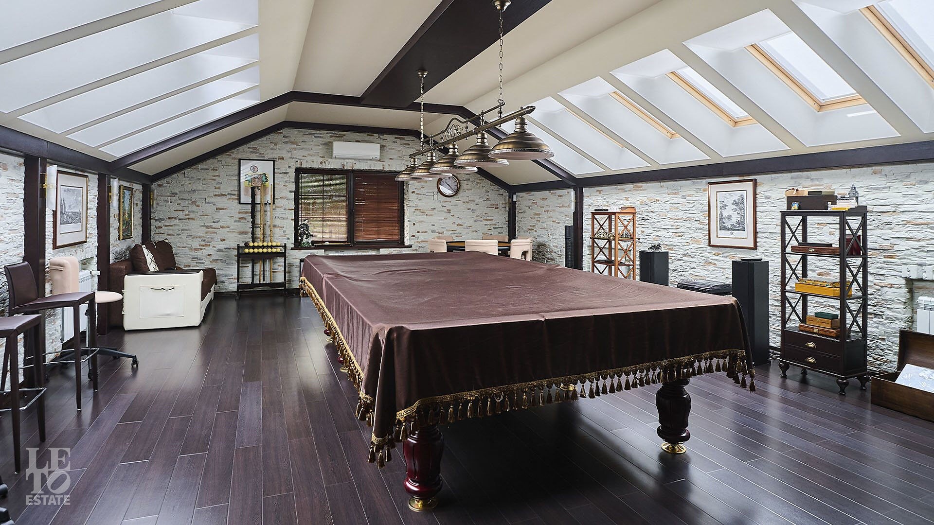 Планировка включает 7 спален, кухню-столовую и просторную гостиную с двухсторонним камином, вторым светом и панорамными окнами, наполняющими пространство солнечными лучами. Кроме того, на территории разместили SPA-комплекс с бассейном, сауной и комнатой отдыха, где можно расслабиться за бильярдом или просмотром фильмов. Дополняют инфраструктуру домик для барбекю, гараж на 4 машиноместа с квартирой для персонала площадью 70 м² и теплица.
