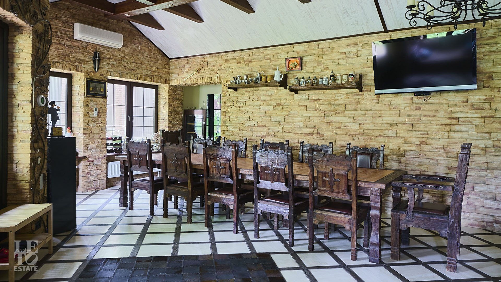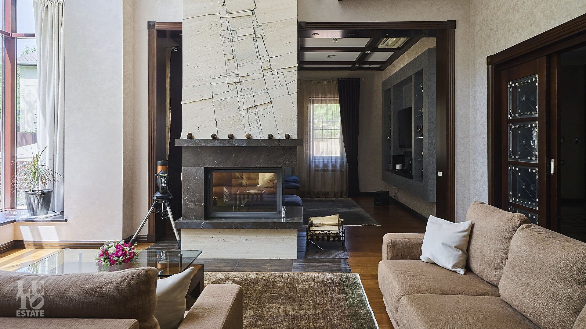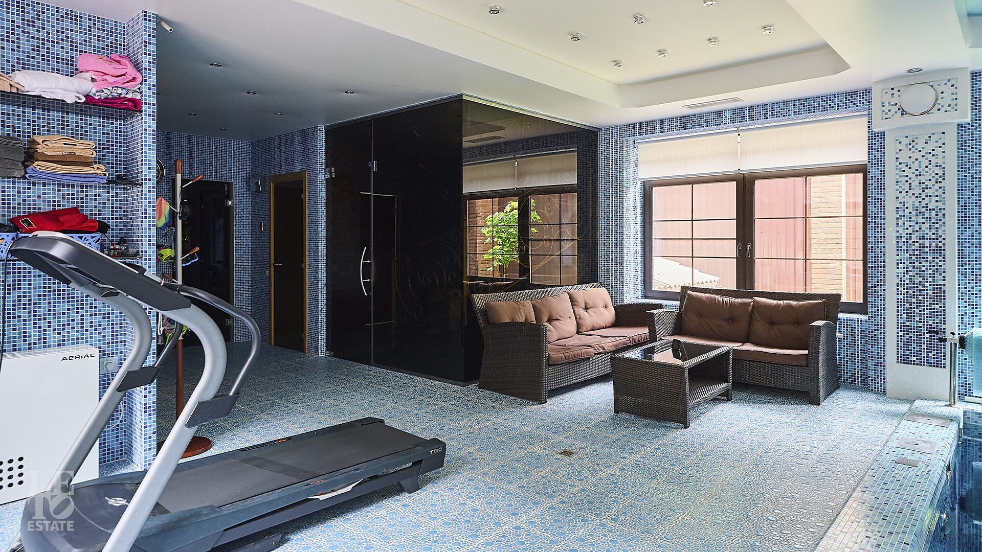 Планировка включает 7 спален, кухню-столовую и просторную гостиную с двухсторонним камином, вторым светом и панорамными окнами, наполняющими пространство солнечными лучами. Кроме того, на территории разместили SPA-комплекс с бассейном, сауной и комнатой отдыха, где можно расслабиться за бильярдом или просмотром фильмов. Дополняют инфраструктуру домик для барбекю, гараж на 4 машиноместа с квартирой для персонала площадью 70 м² и теплица.