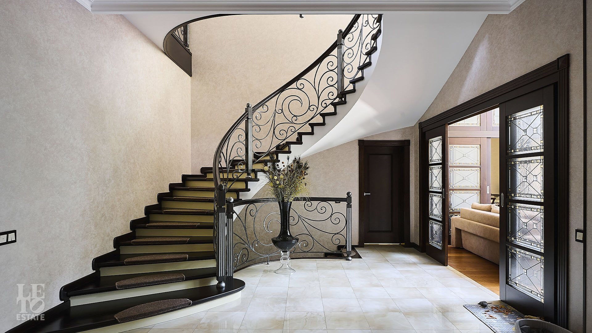 Фасад выполнен в европейском стиле, облицован благородным красным кирпичом и плиткой с фактурой камня по цоколю, а также украшен элегантными колоннами и коваными элементами. Современные интерьеры оформлены в светлых тонах с акцентом на высококачественные материалы.