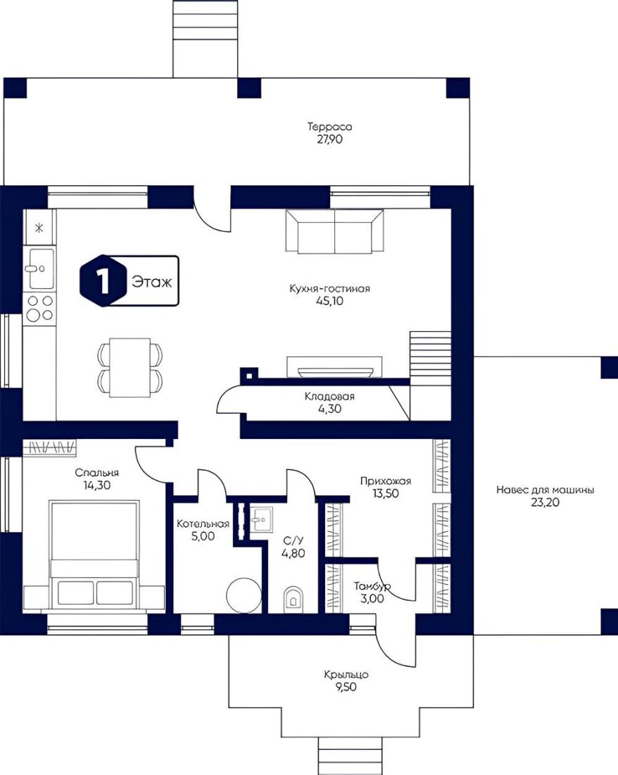 Первый этаж: просторная кухня-гостиная с выходом на открытую террасу, спальня, ванная комната, туалетная комната.