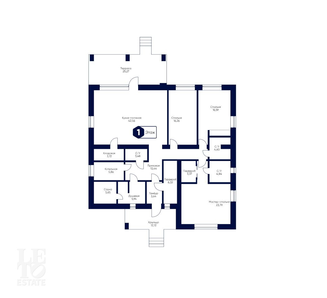 Первый этаж: прихожая, гардеробная, ванная комната, сауна, кухня-гостиная, кладовая, две спальни, ванная комната, мастер-спальня со своей ванной комнатой и гардеробной, терраса.