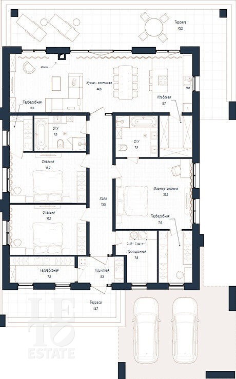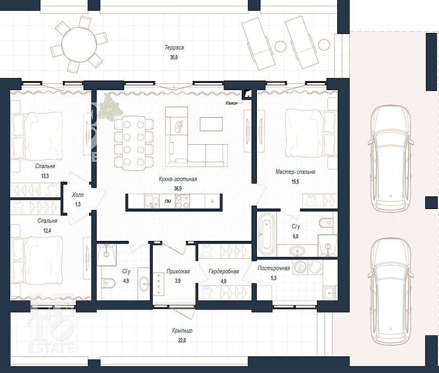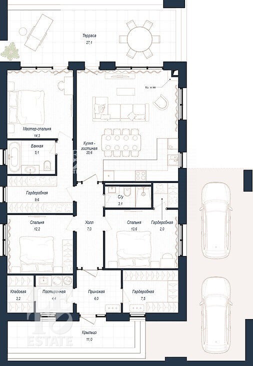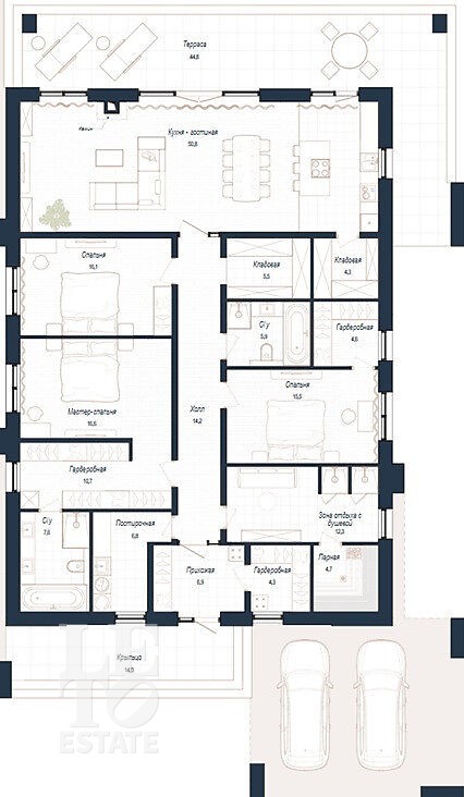 Первый этаж: прихожая, холл, кухня-гостиная, 3 спальни, 1-3 гардеробные, 2-3 с/у, постирочная, 1-2 кладовые, зона отдыха с душевой, парная, терраса, крыльцо.