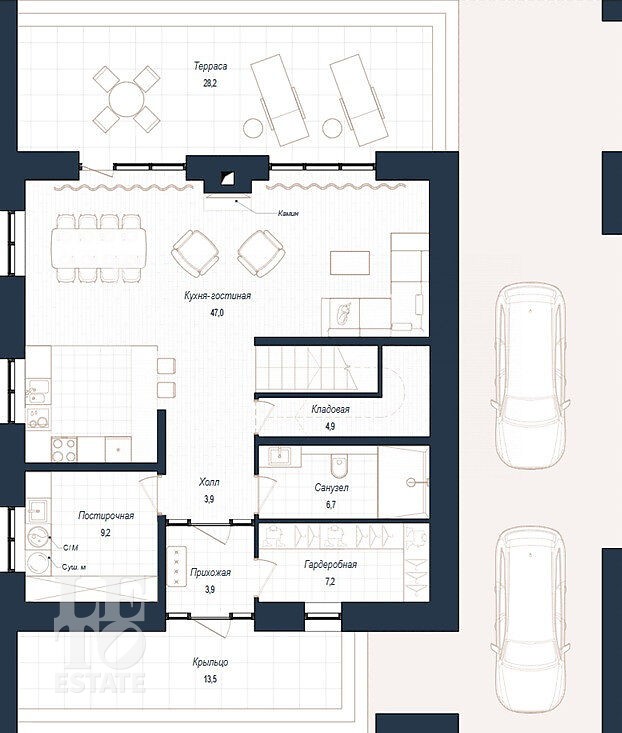 Дом воплощает строгую геометрию: четкие прямые линии, отсутствие лишнего декора и плоская кровля подчеркивают современную эстетику. Лаконичные формы сочетаются с продуманной функциональностью, создавая комфортное и технологичное пространство.