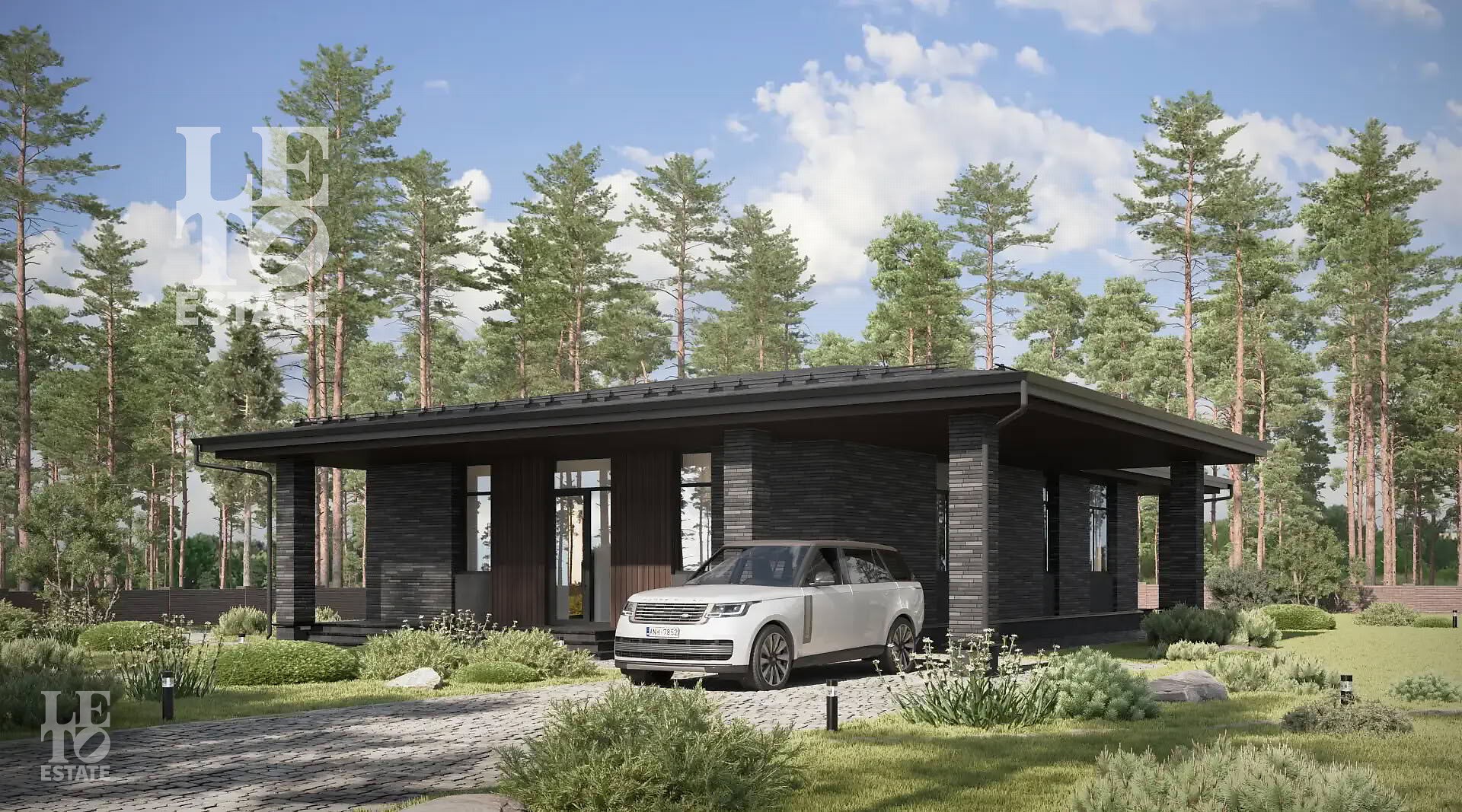 Стиль выражен через четкие горизонтальные линии, выходящие за пределы конструкции, и 4-скатную крышу с низким коньком и широкими свесами. Это создает эффект почти плоской поверхности, усиливая гармонию с природой.