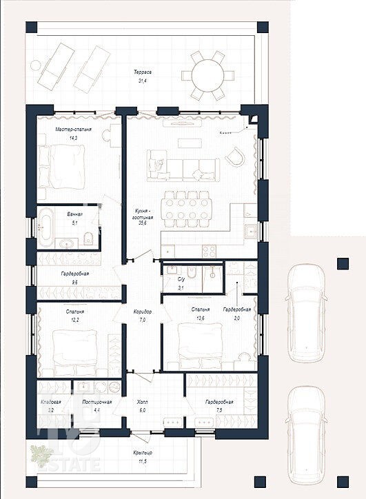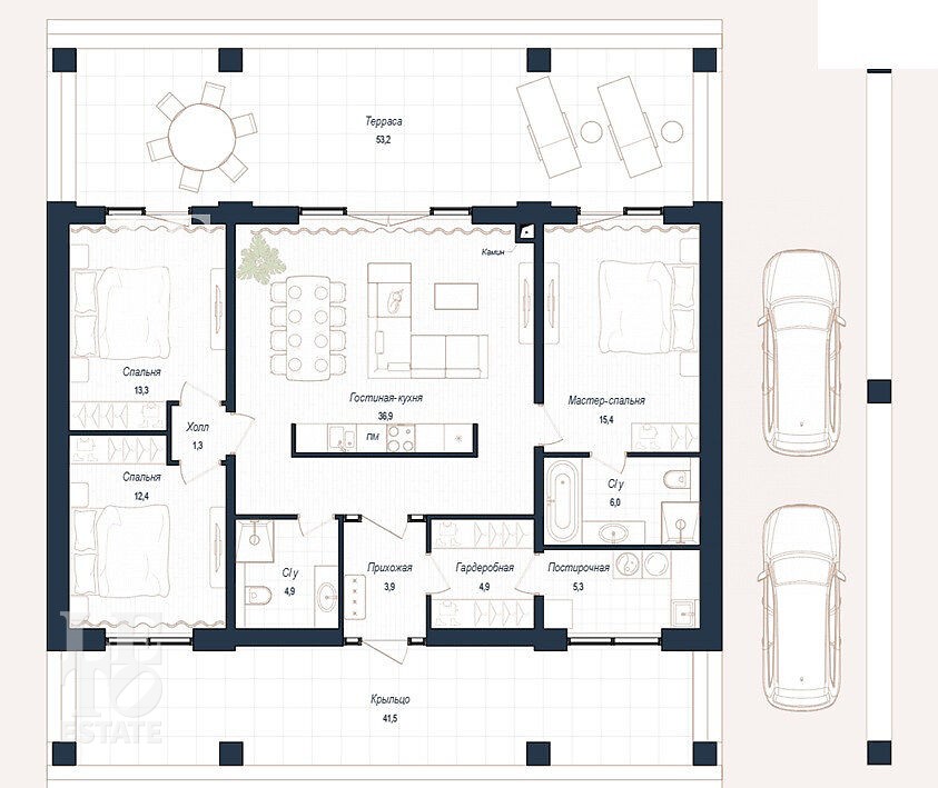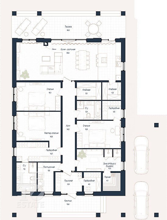 Первый этаж: прихожая, холл, кухня-гостиная, 3 спальни, 1-3 гардеробные, 2-3 с/у, постирочная, 1-2 кладовые, зона отдыха с душевой, парная, терраса, крыльцо.