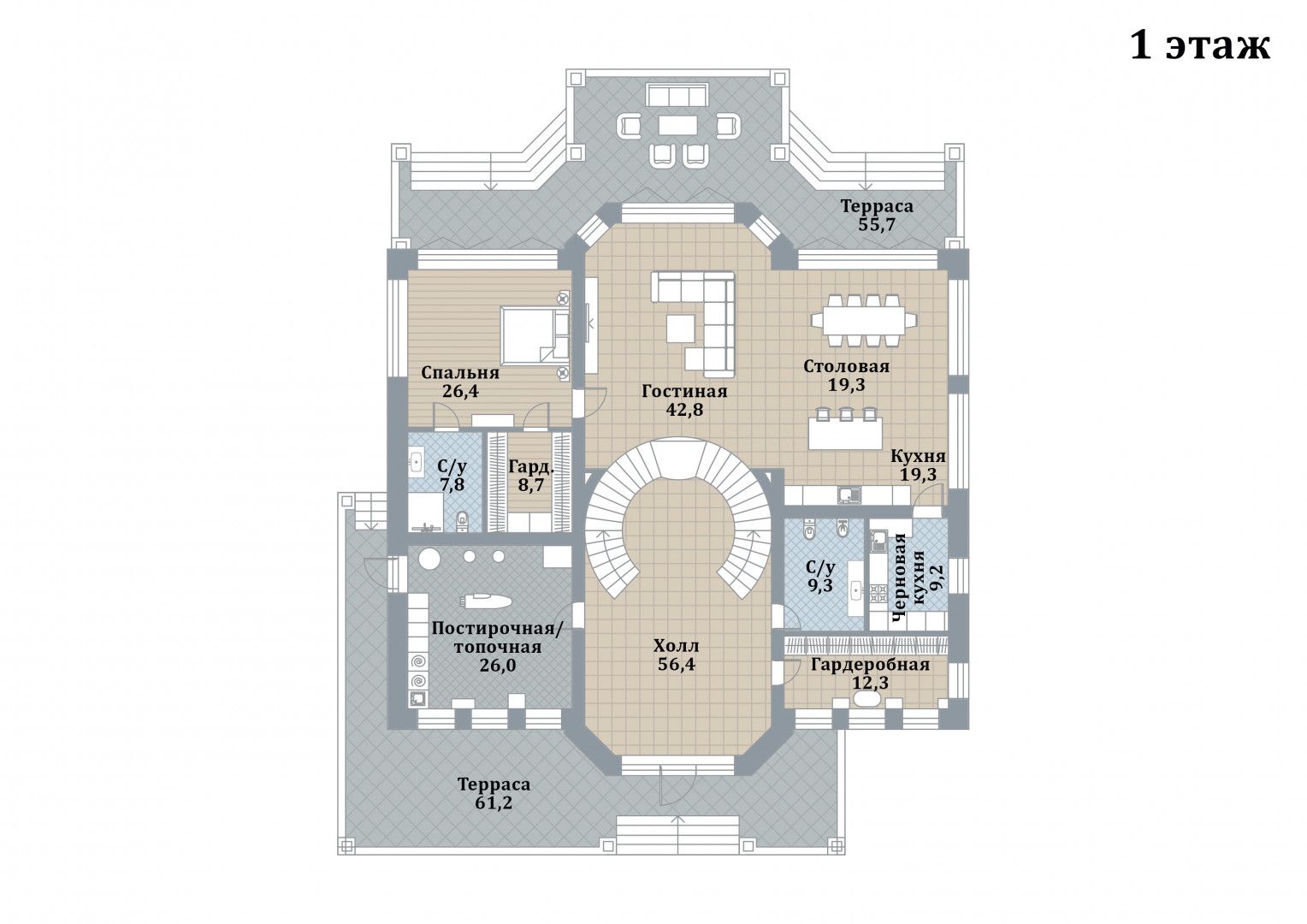 1 этаж: холл, гардеробная, санузел, гостиная, столовая с кухонной зоной, черновая кухня, спальня с санузлом и гардеробной, котельная.
