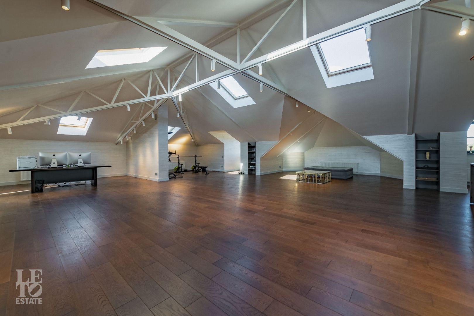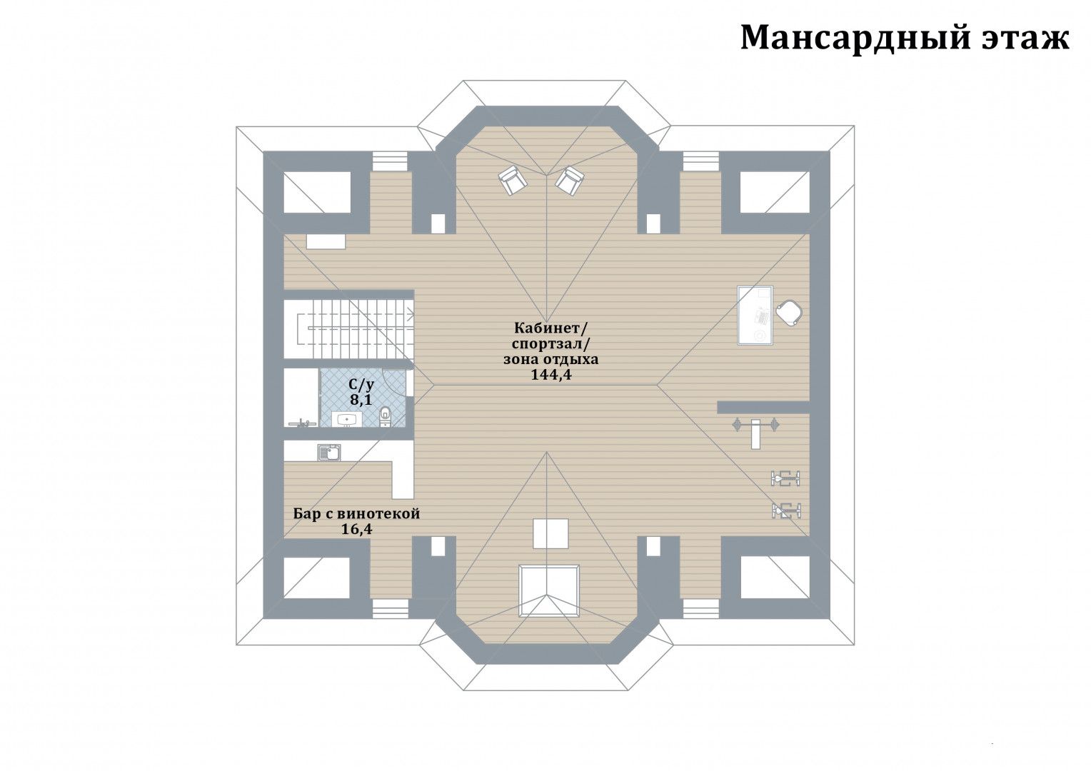 Мансарда: комната отдыха, барная зона, кабинет, спортзал, санузел