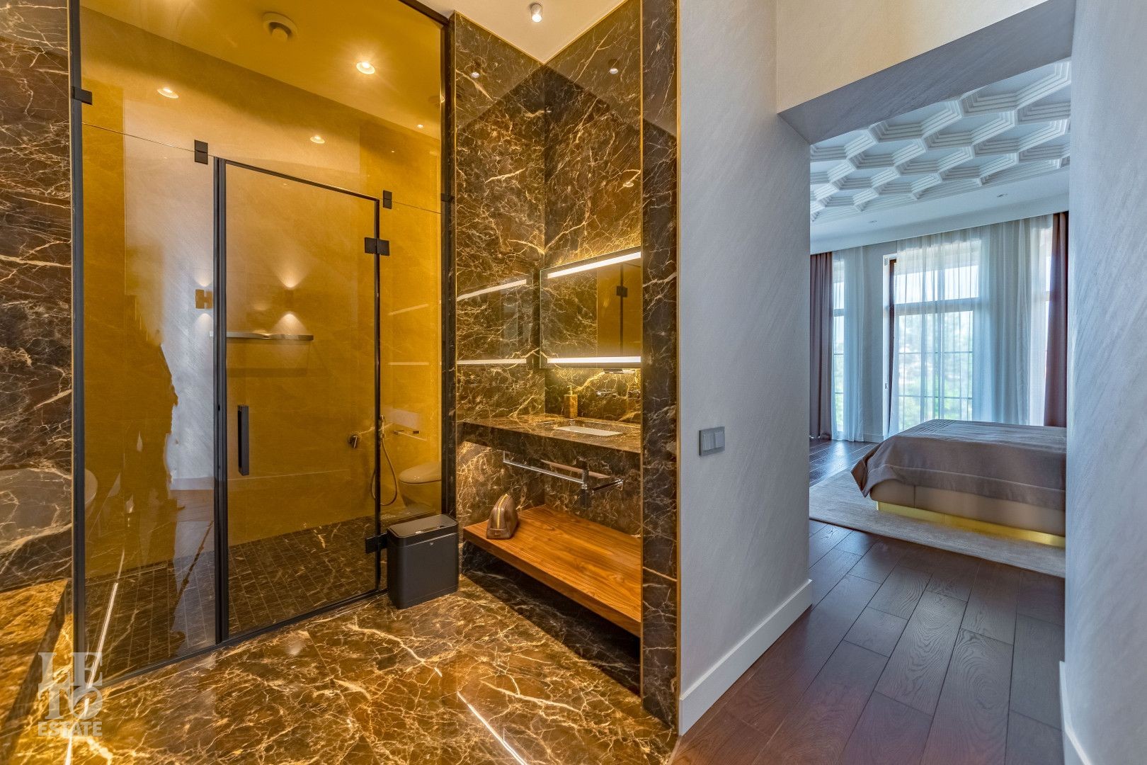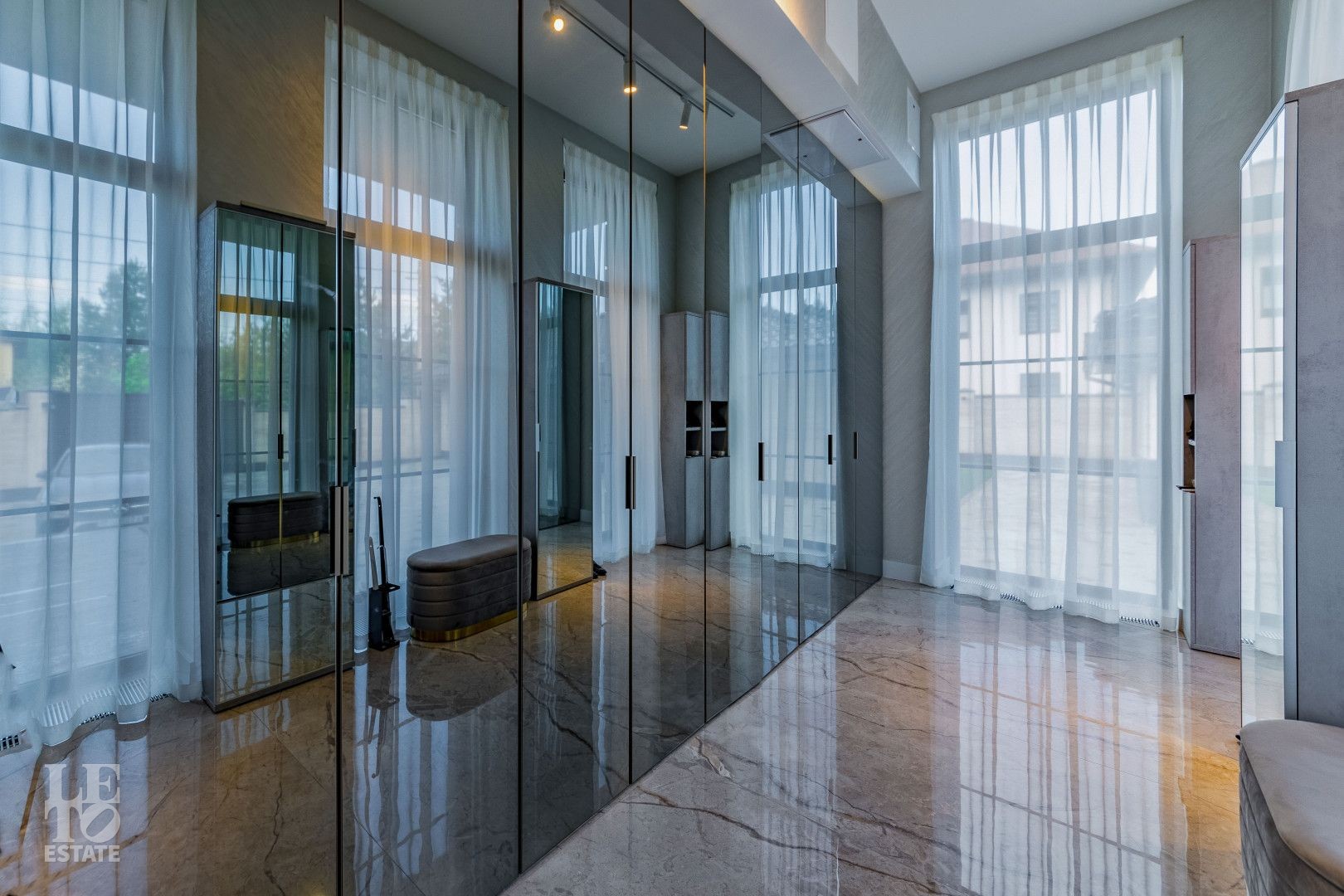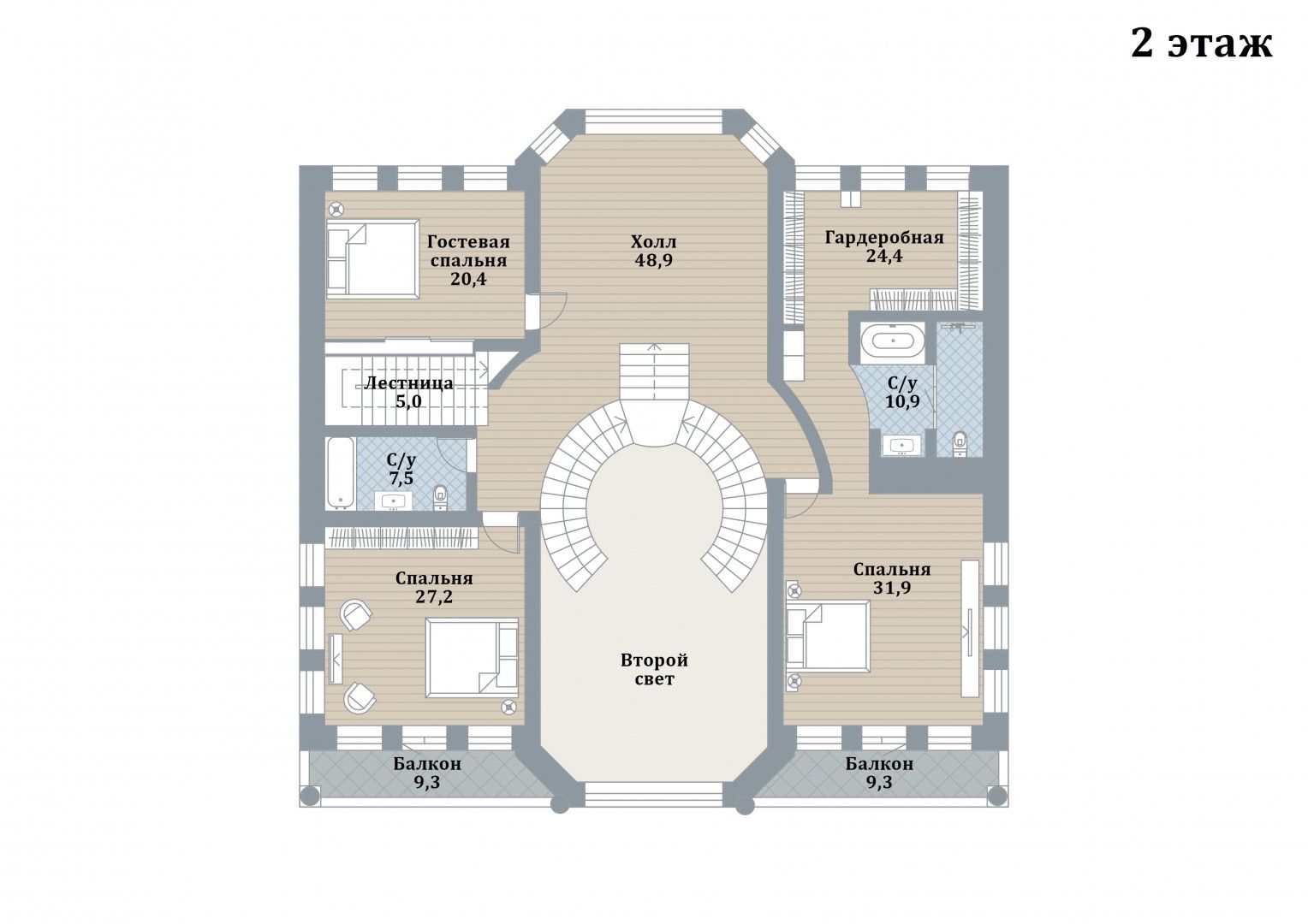 2 этаж: холл, мастер-спальня с санузлом и гардеробной, 2 спальни с гардеробными, санузел