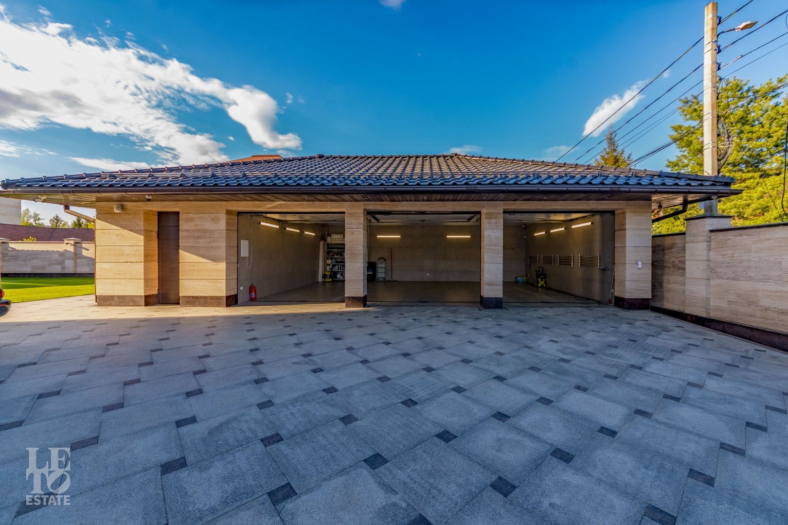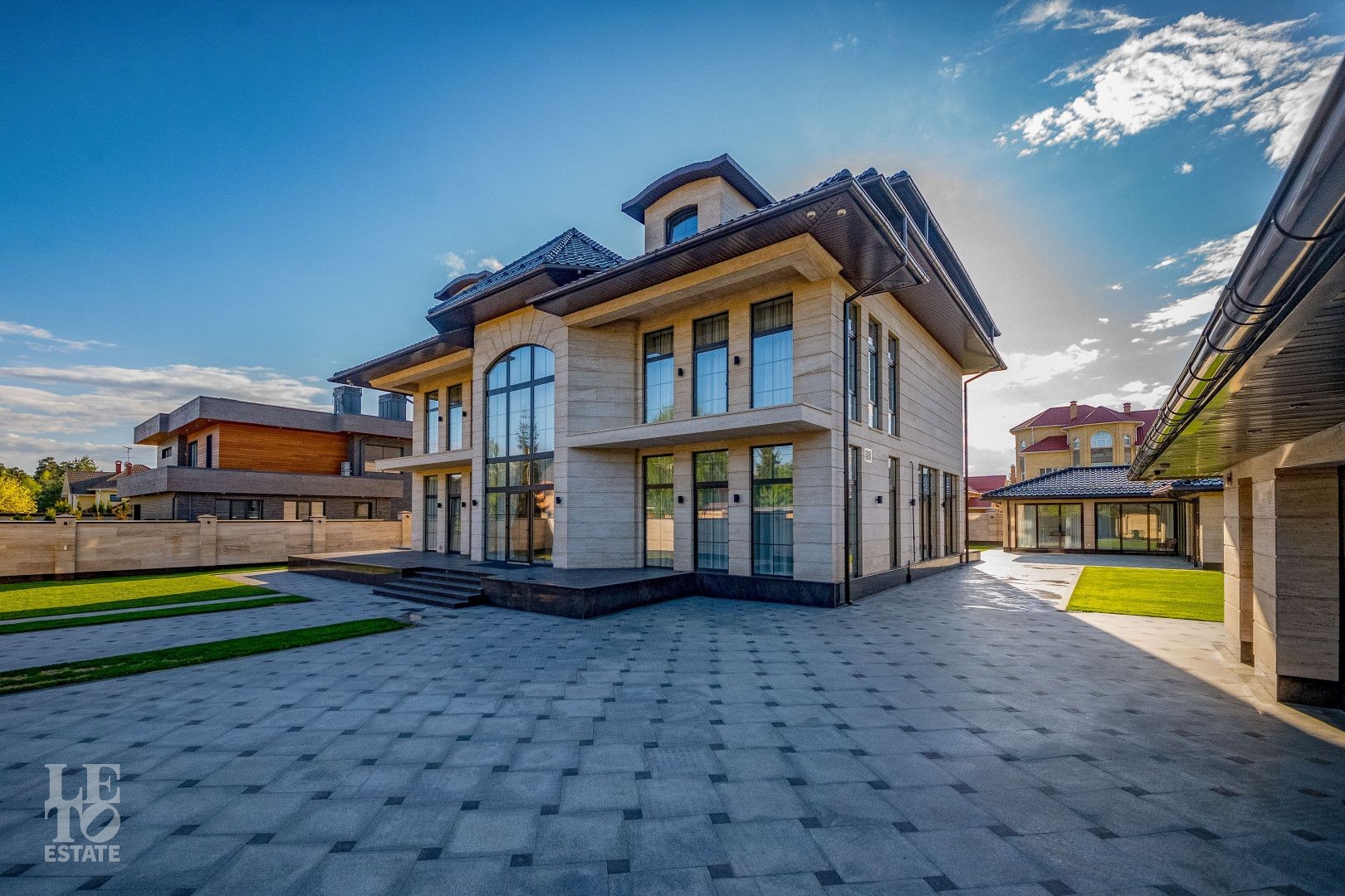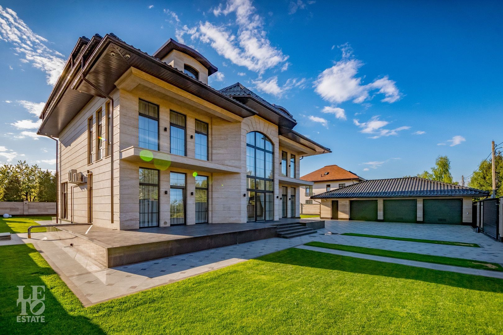 Участок площадью 20 соток имеет эргономичный дизайн. Сделан автополив и дренаж. На территории находятся зона отдыха, летняя кухня, квартира для персонала, предусмотрен теплый гараж для 2 автомобиля, а также парковочная площадка для 5 автомобилей.