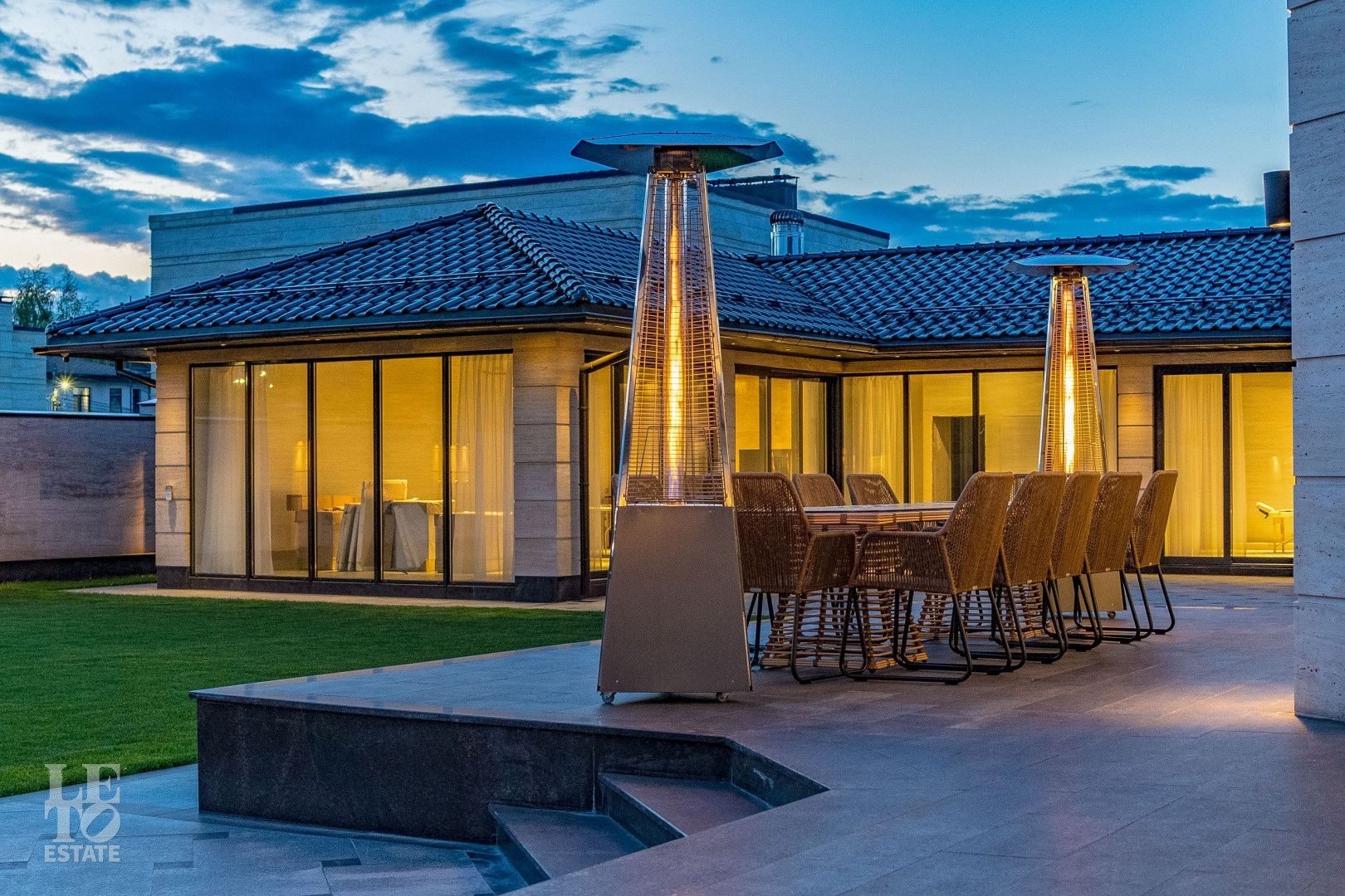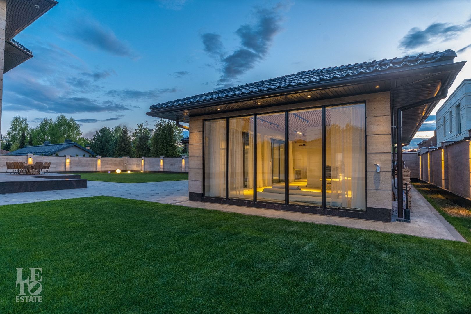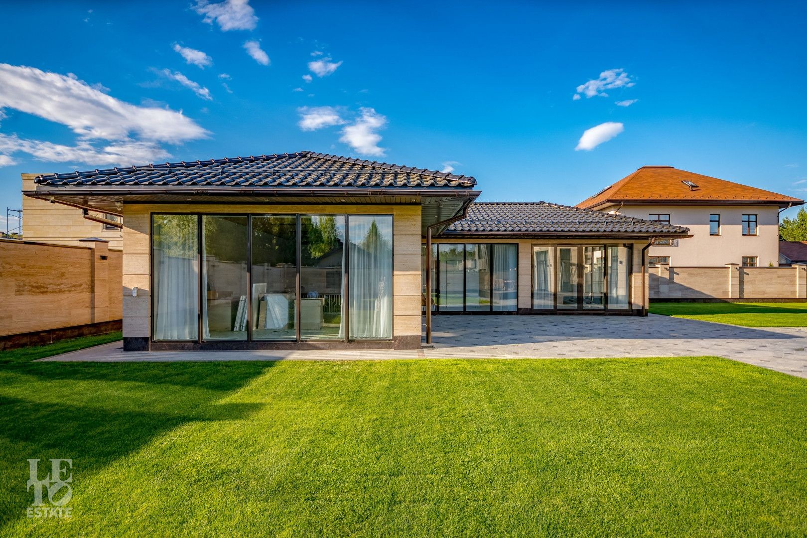 Участок площадью 20 соток имеет эргономичный дизайн. Сделан автополив и дренаж. На территории находятся зона отдыха, летняя кухня, квартира для персонала, предусмотрен теплый гараж для 2 автомобиля, а также парковочная площадка для 5 автомобилей.